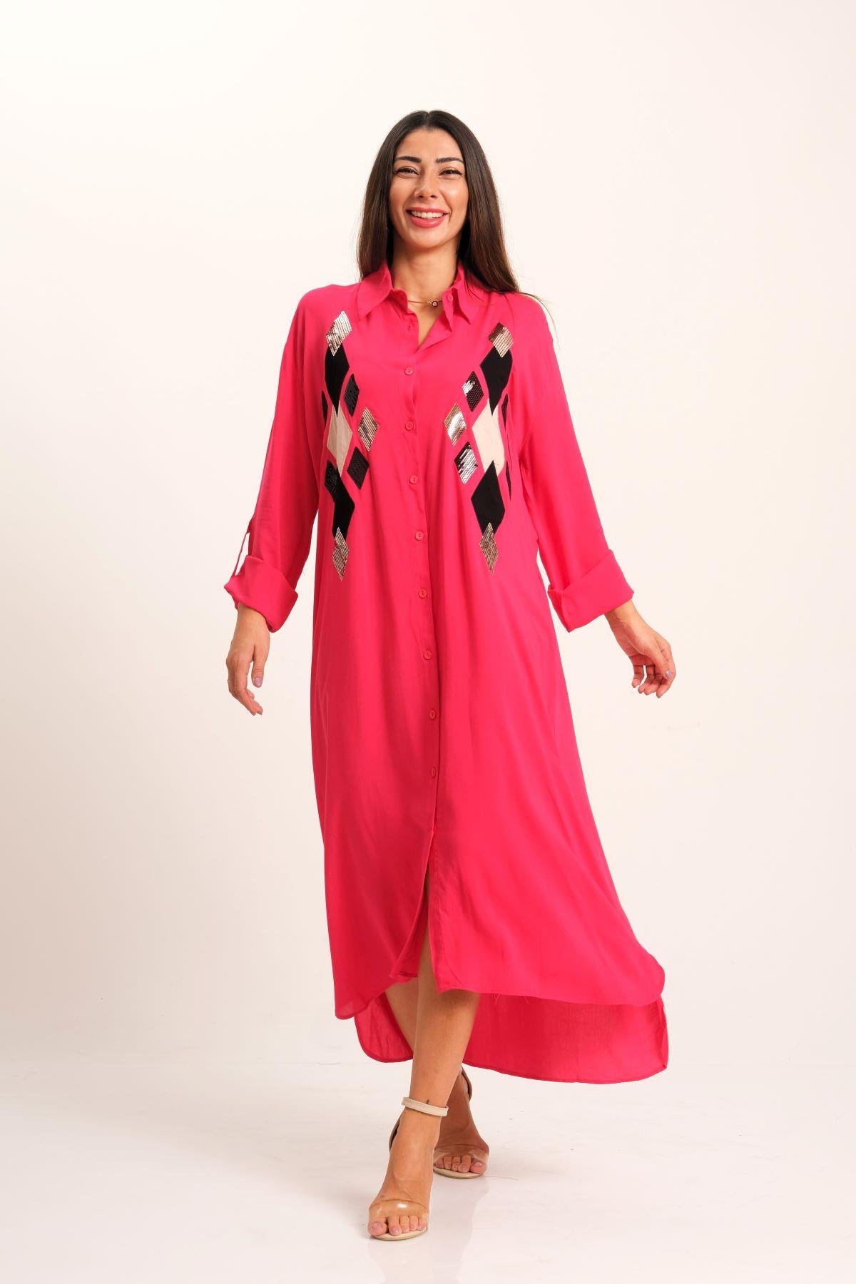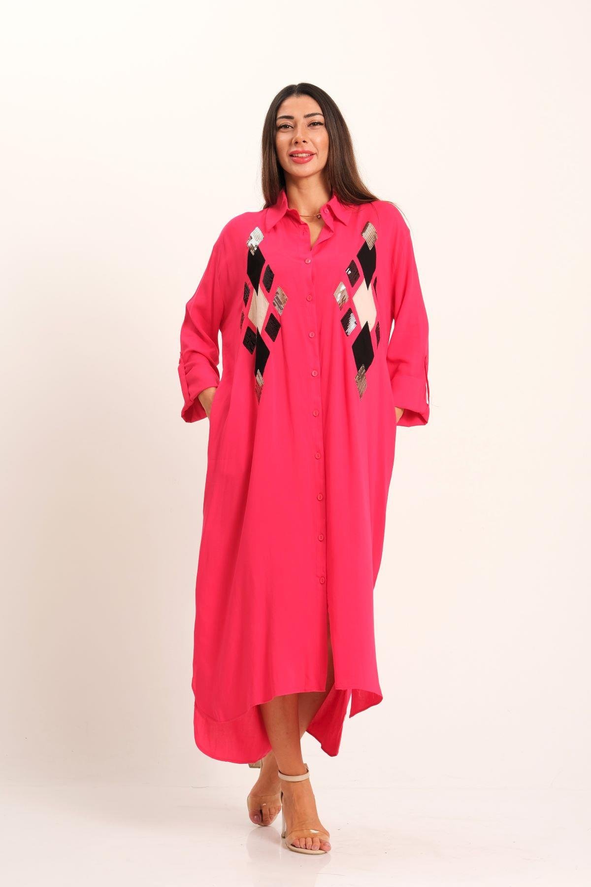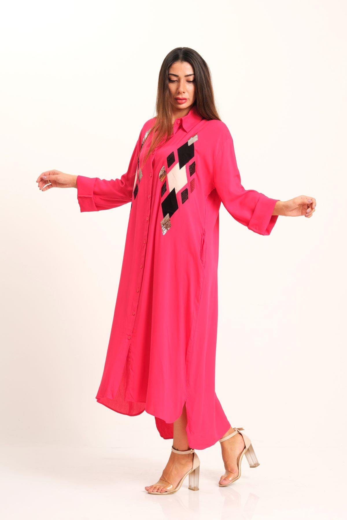 Pembe Önü Pul Payet Aplike Nakışlı Kolu Apoletli Uzun Gömlek Elbise