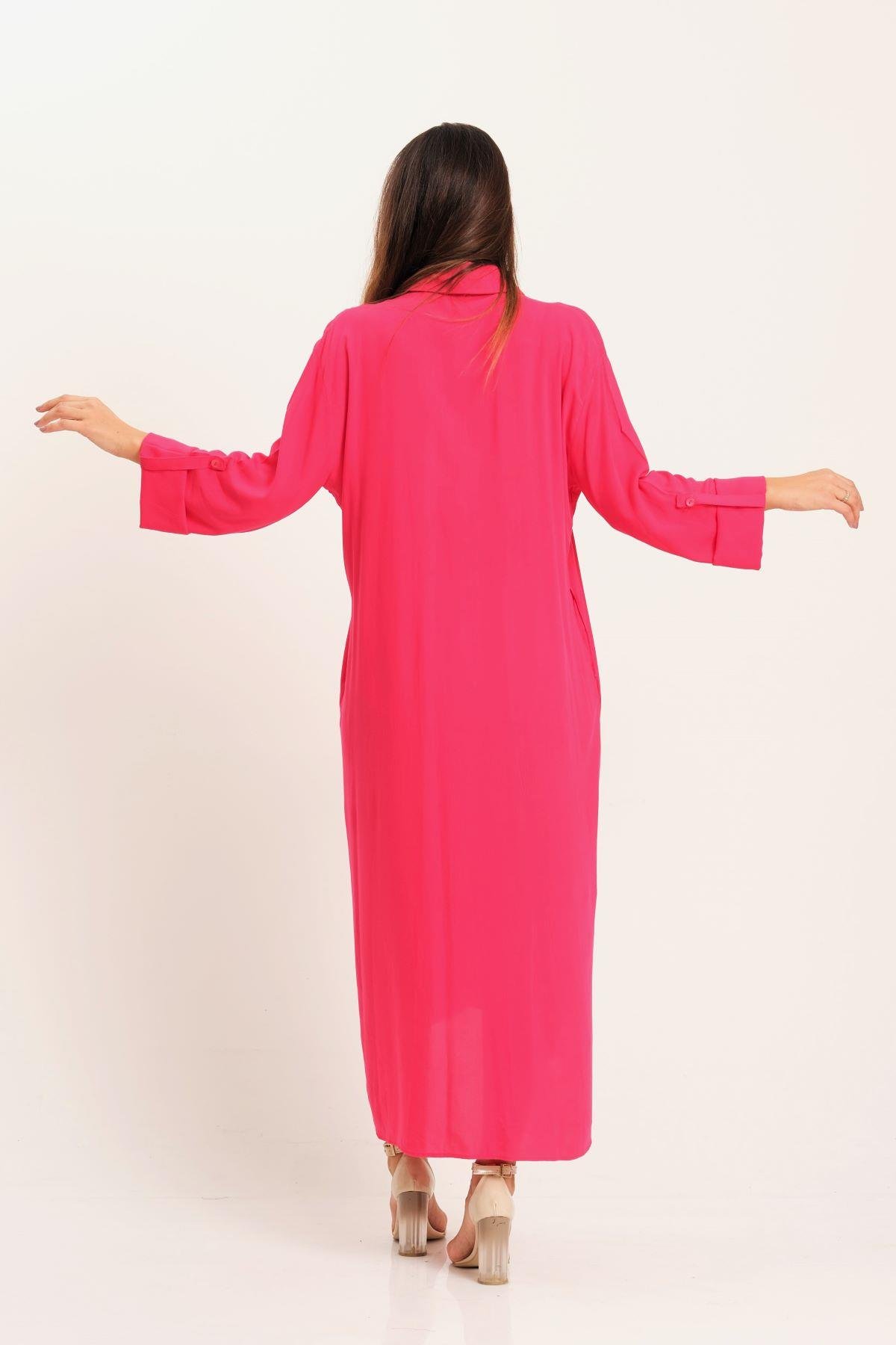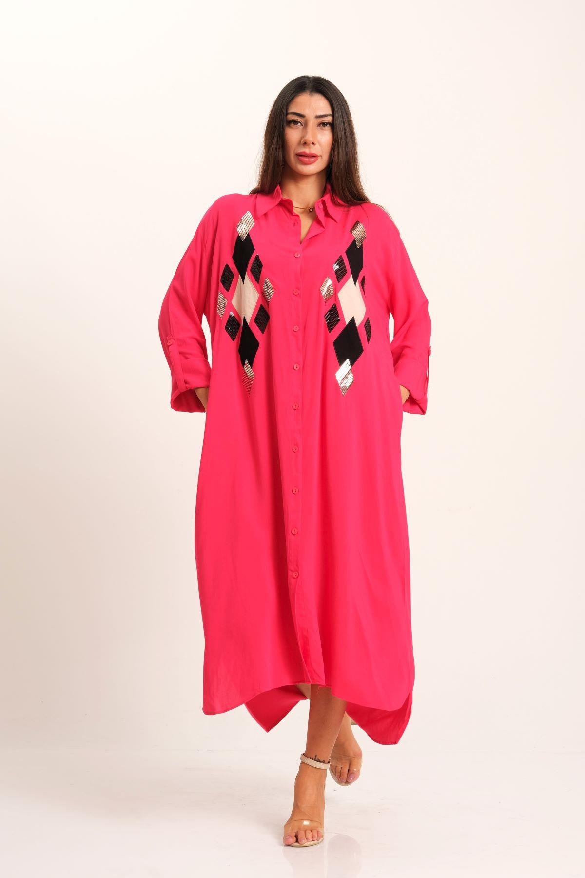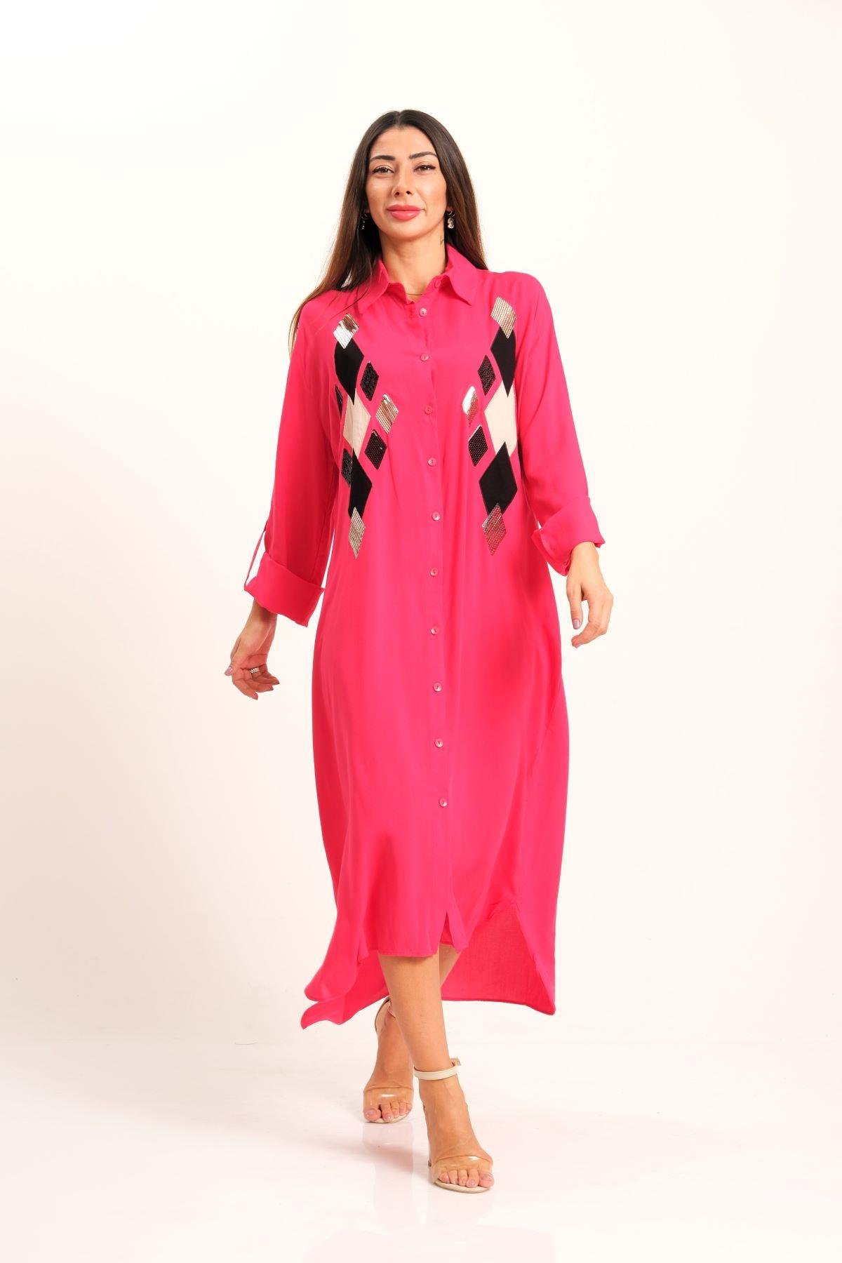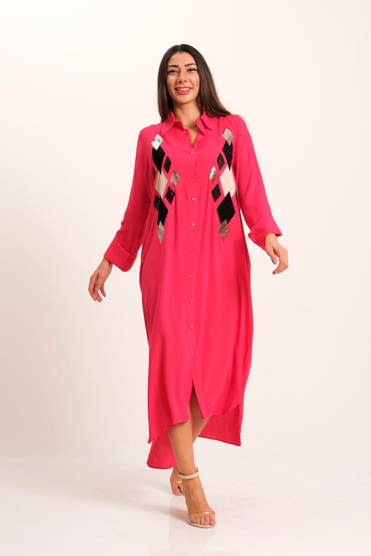 Pembe Önü Pul Payet Aplike Nakışlı Kolu Apoletli Uzun Gömlek Elbise