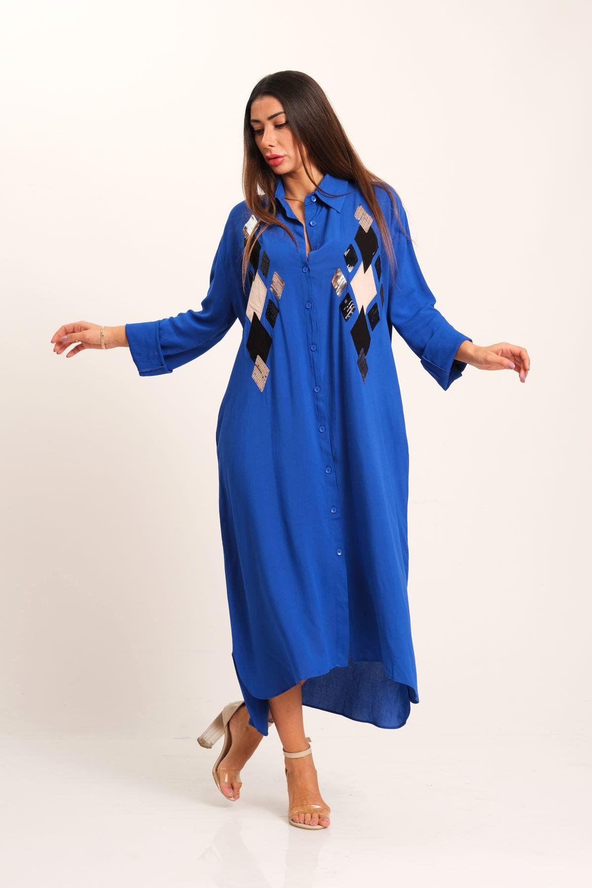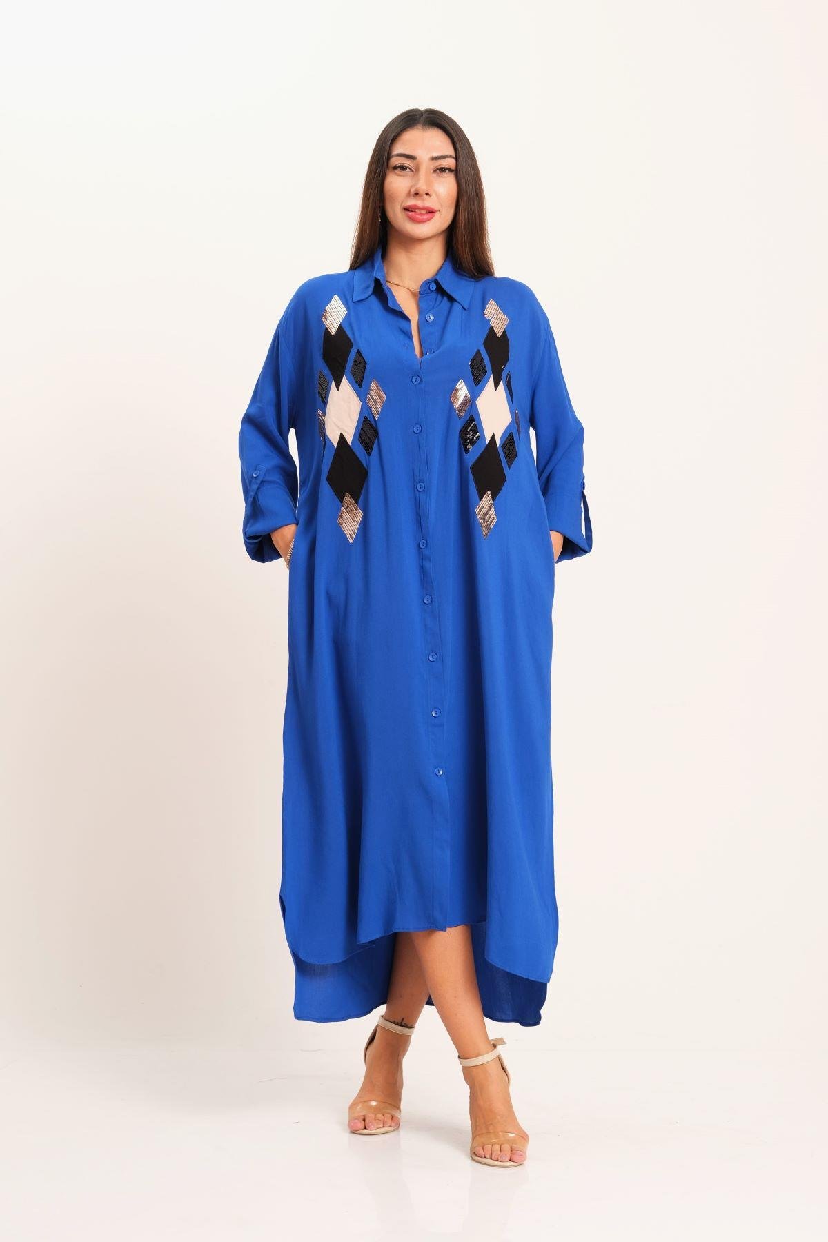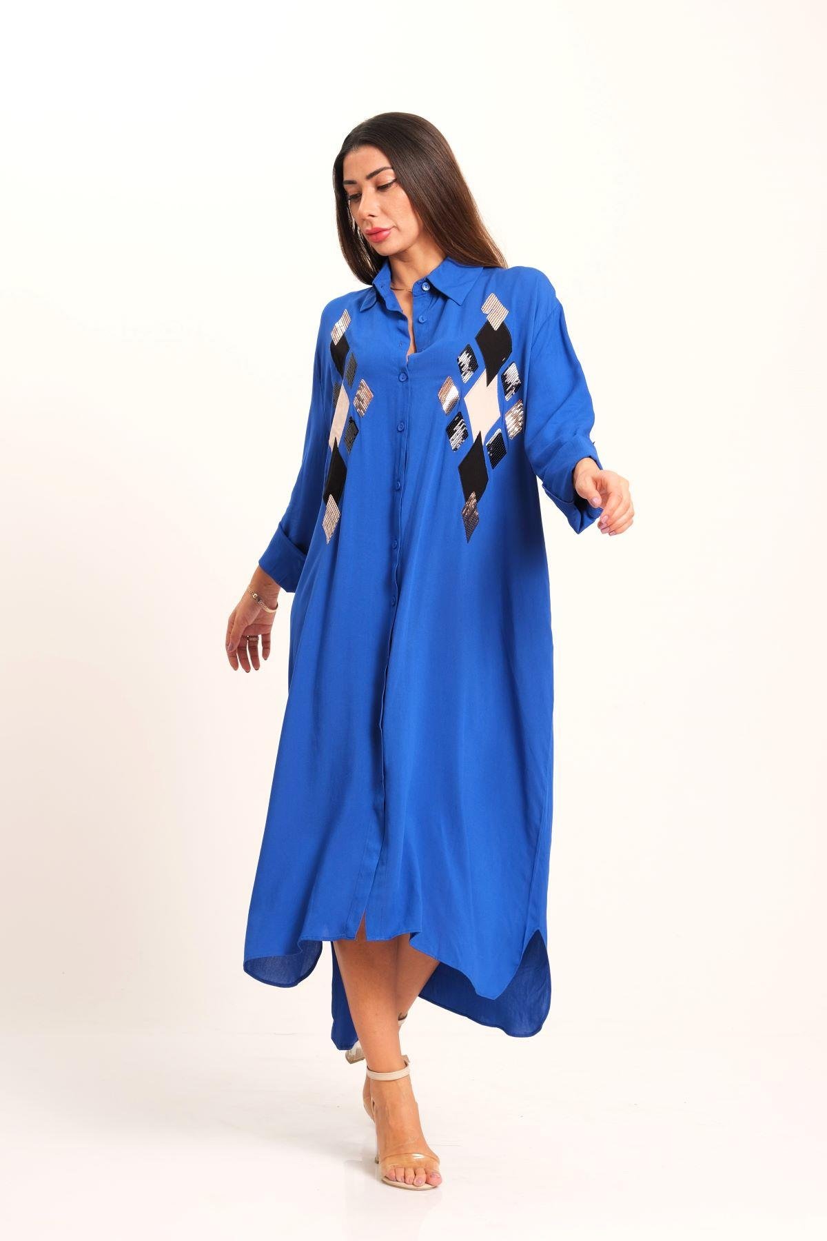 Saks Mavi Önü Pul Payet Aplike Nakışlı Kolu Apoletli Uzun Gömlek Elbise