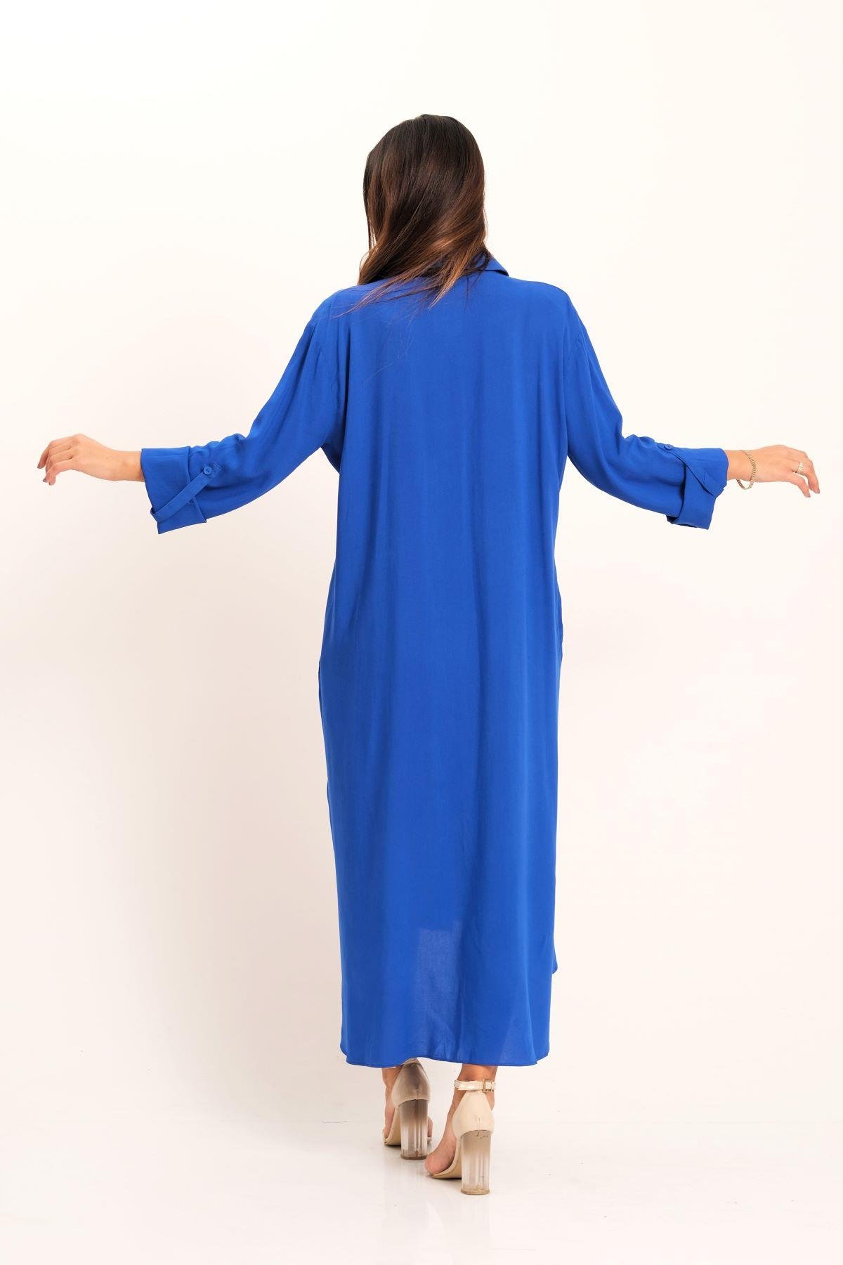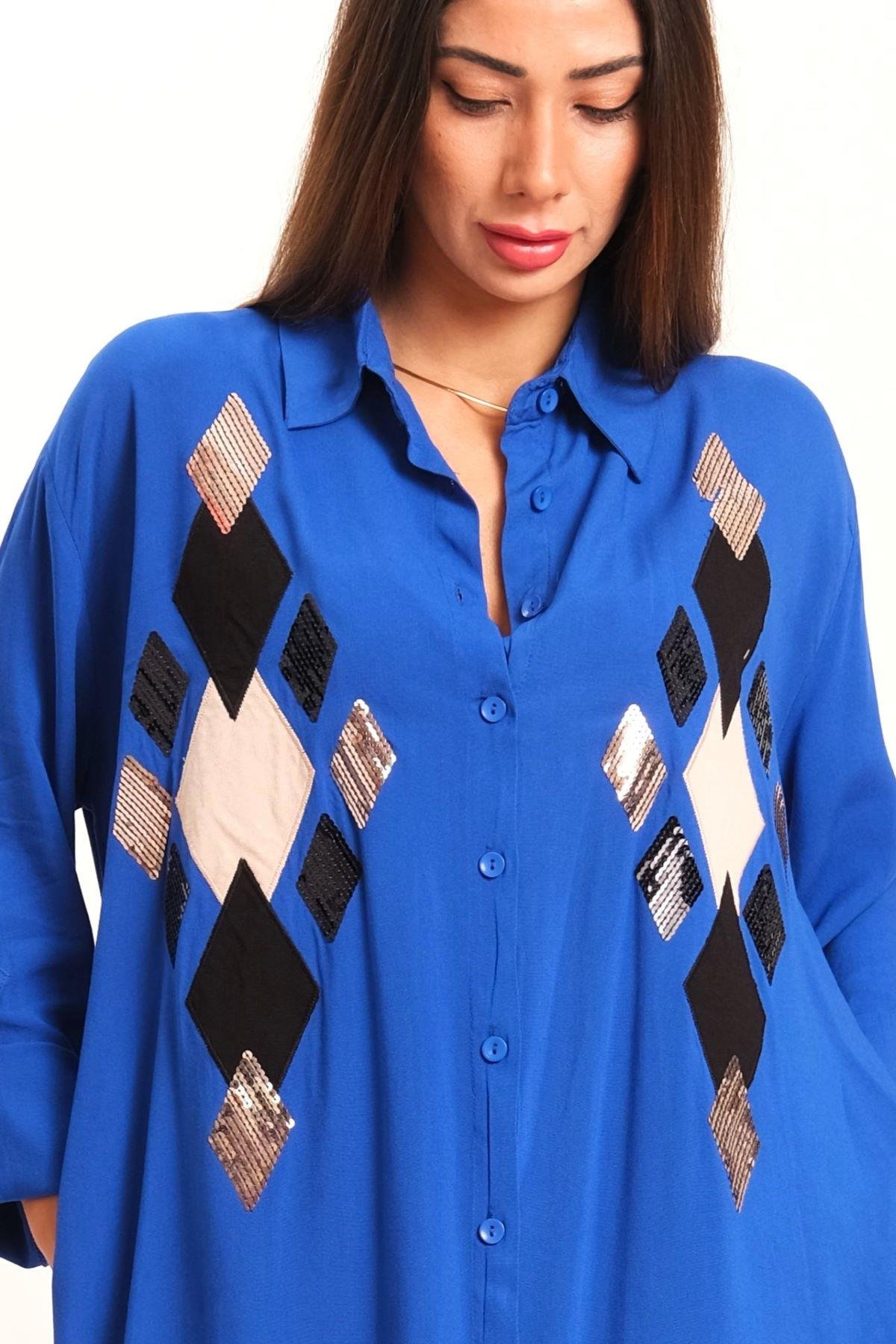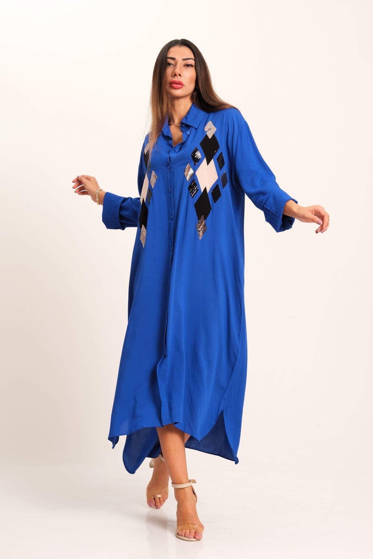 Saks Mavi Önü Pul Payet Aplike Nakışlı Kolu Apoletli Uzun Gömlek Elbise