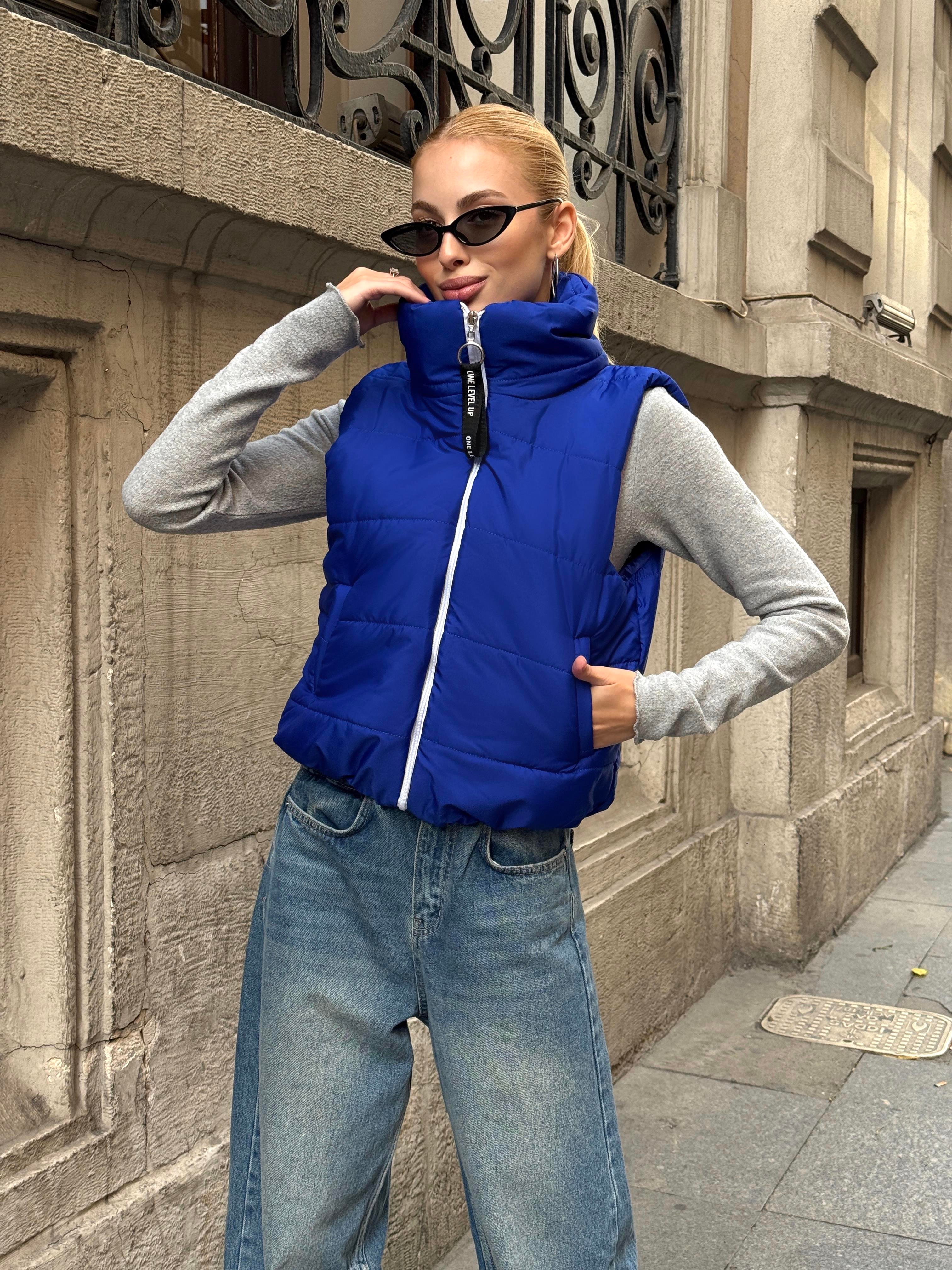 Saks Mavi Sırtı Taş İşlemeli Dik Yaka Kısa Şişme Yelek (YKTSMSS2022)