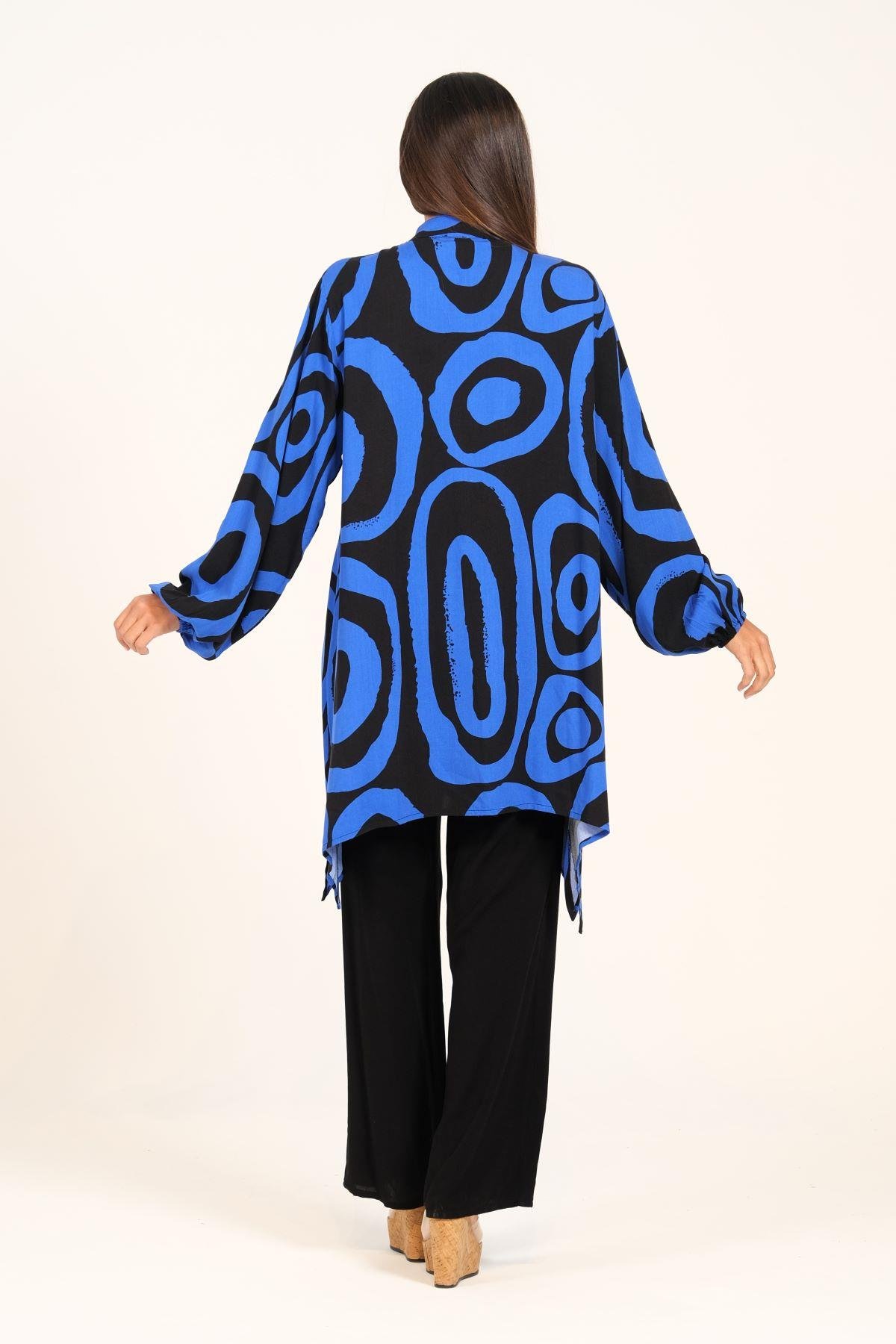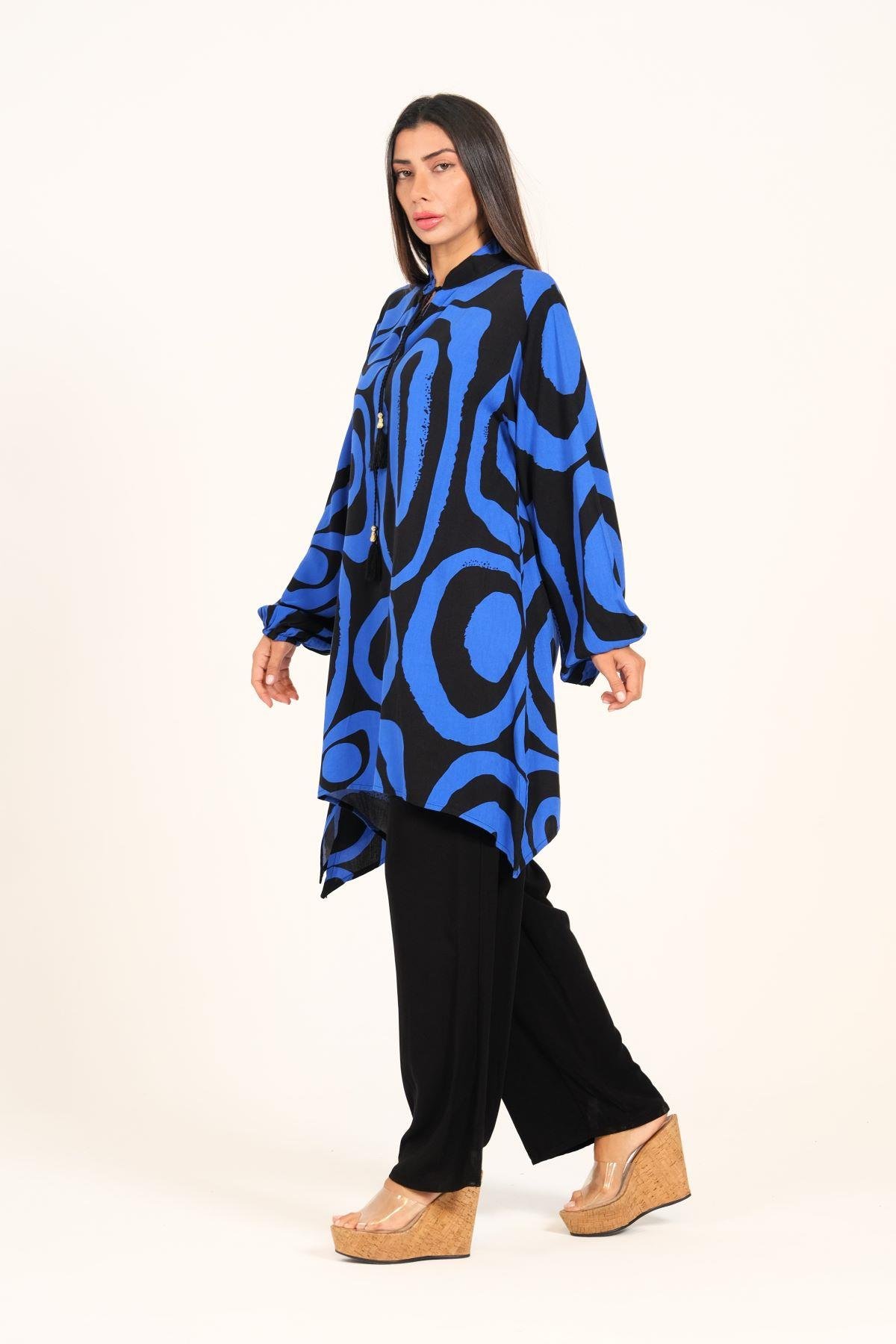 Saks Mavi Siyah Desenli Balon Kol Püskül Bağcıklı Cepli Tunik Pantolon İkili Takım