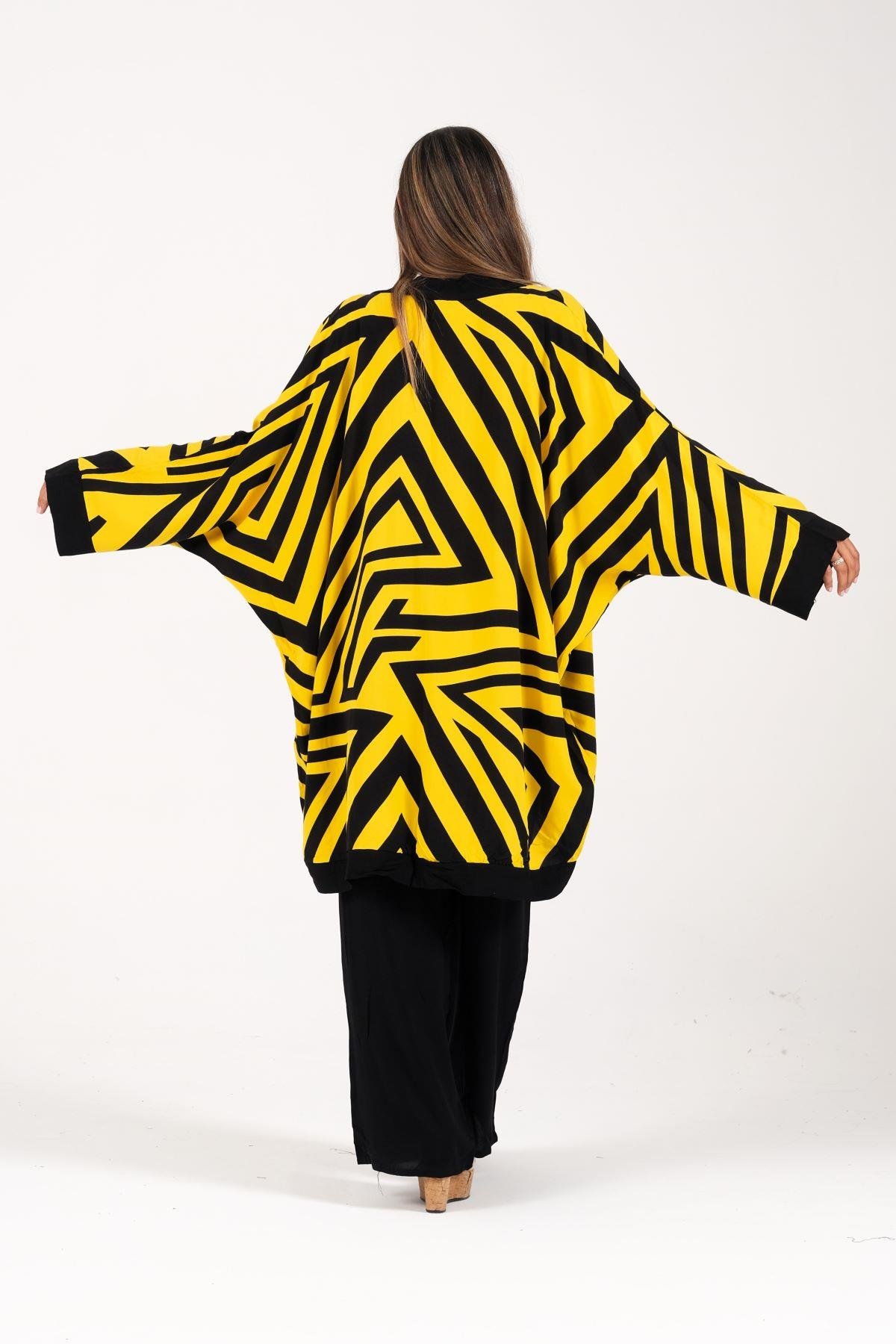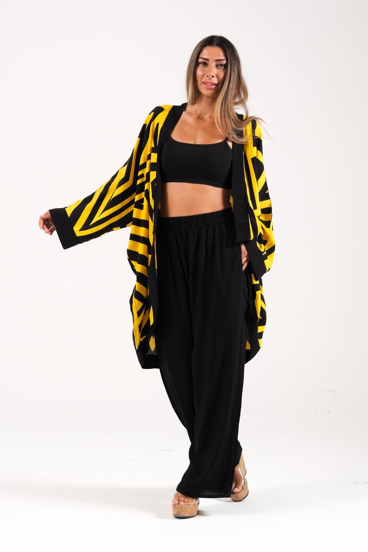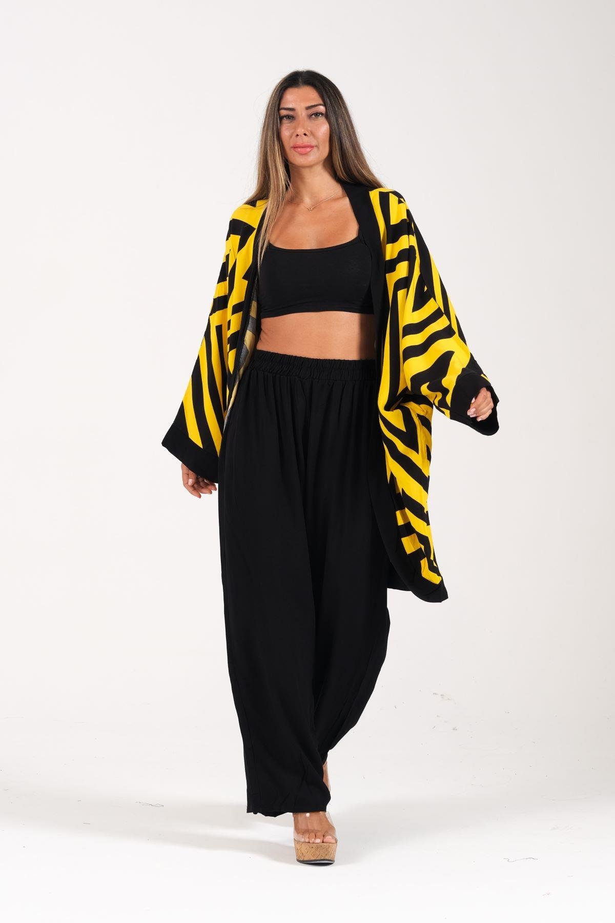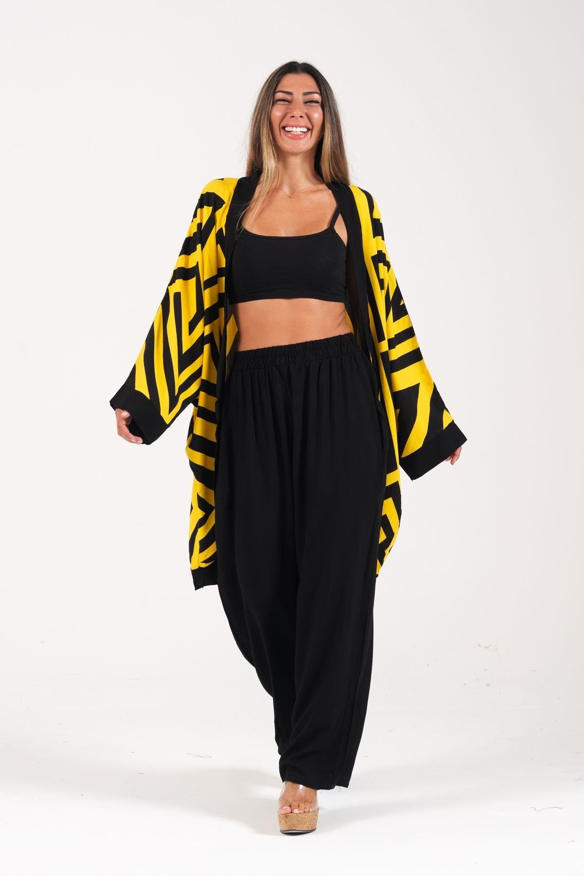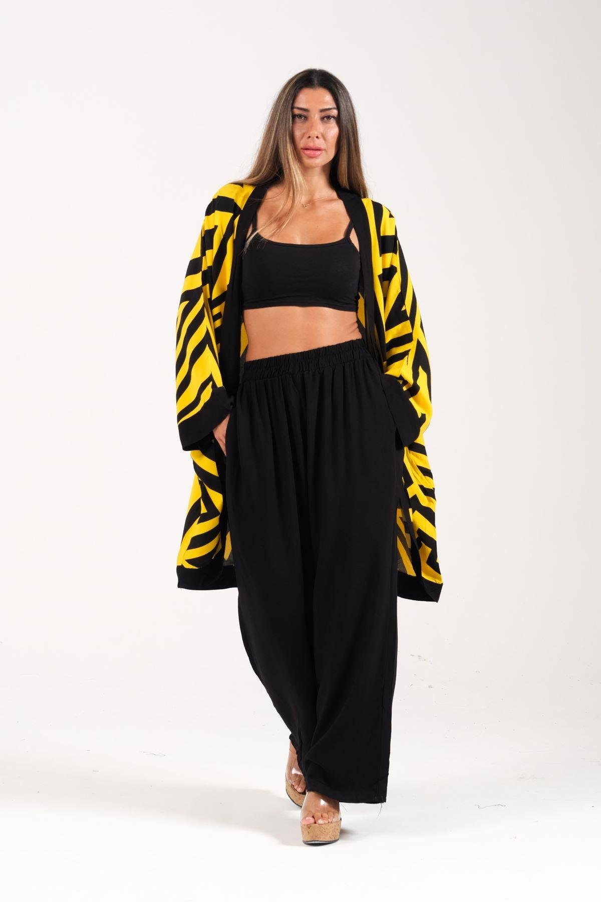 Sarı Siyah Desenli Cepli Gömlek Pantolon İkili Takım