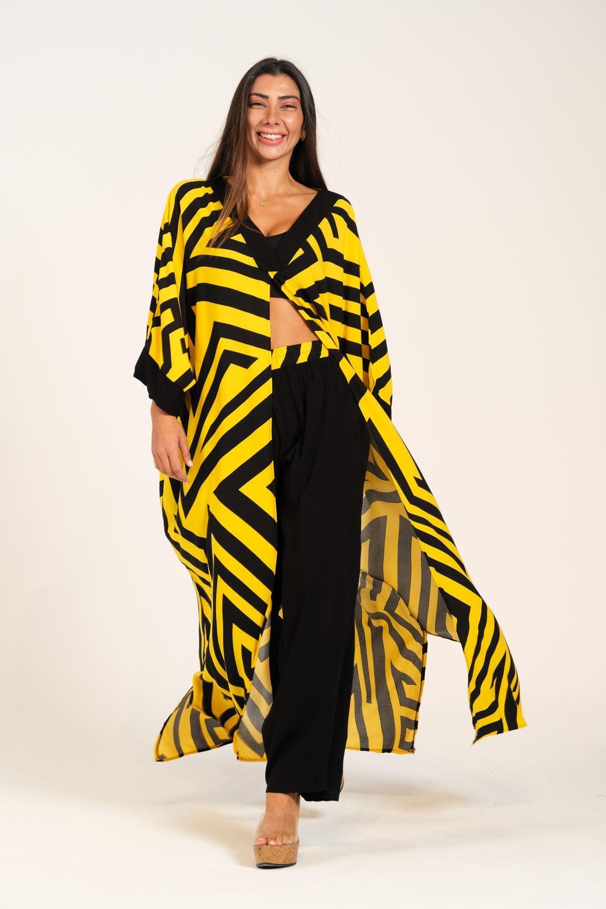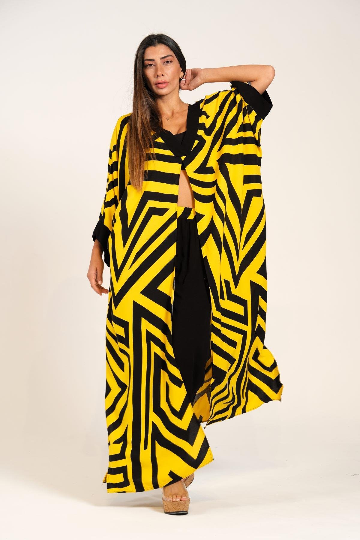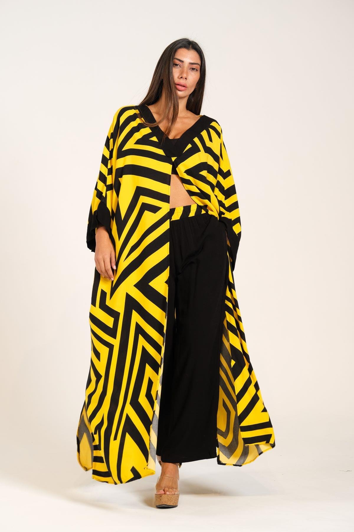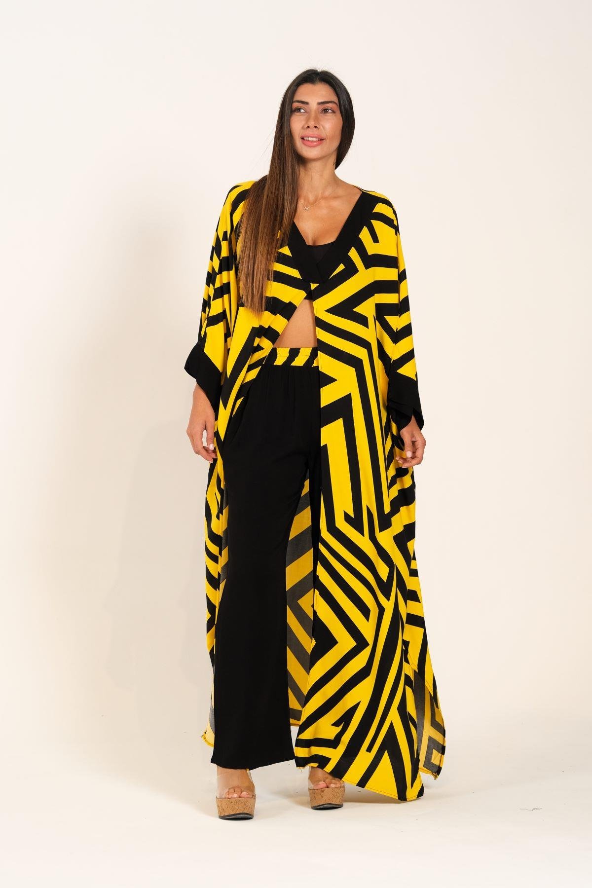 Sarı Siyah Desenli V Yaka Önden Yırtmaçlı Cepli Tunik Pantolon İkili Takım