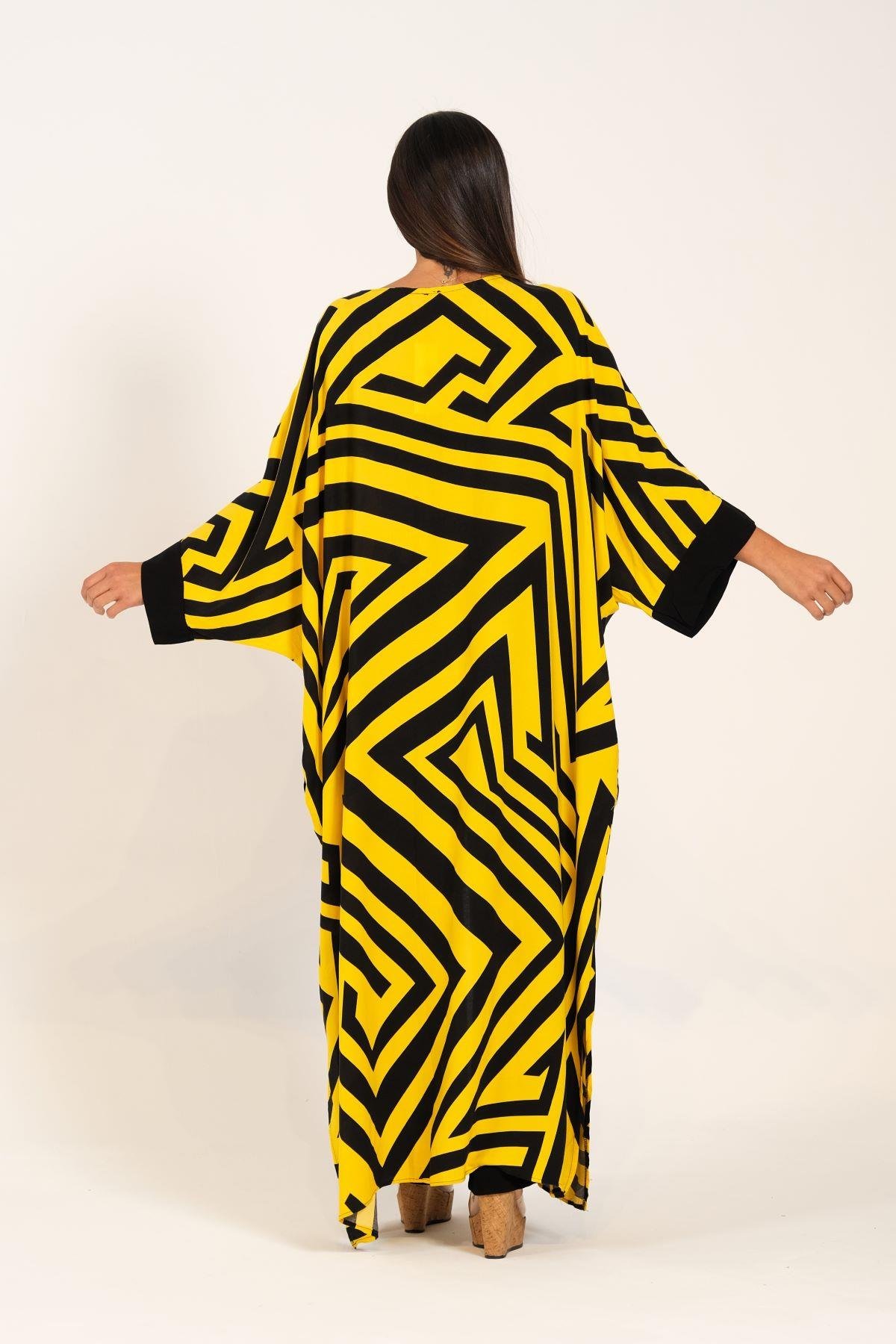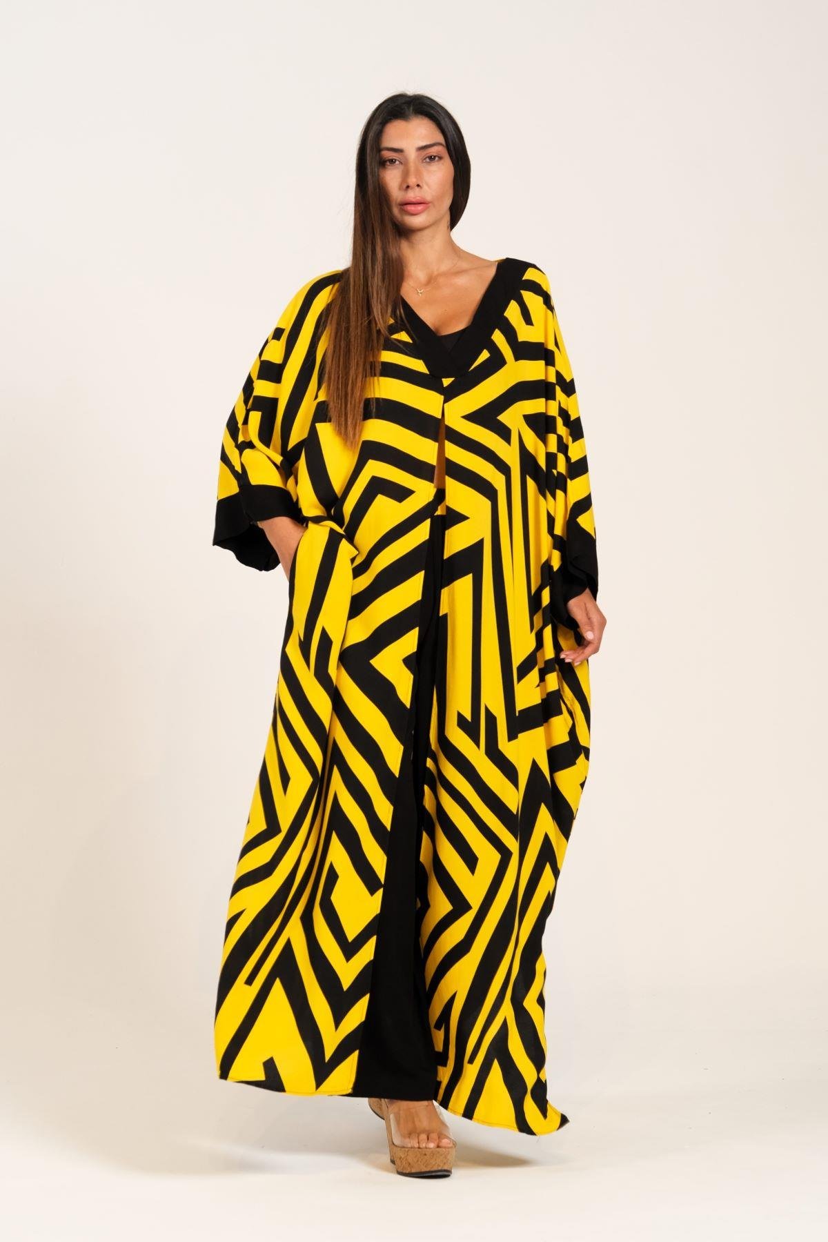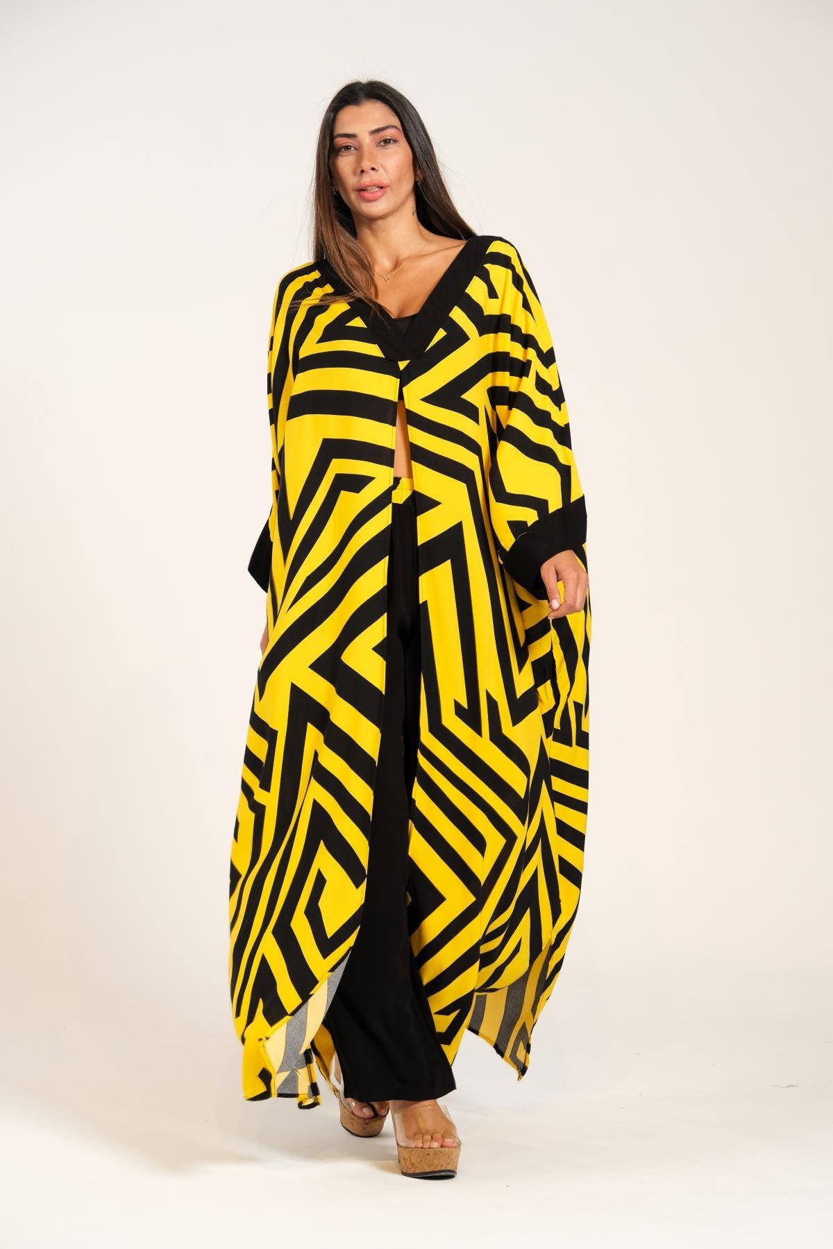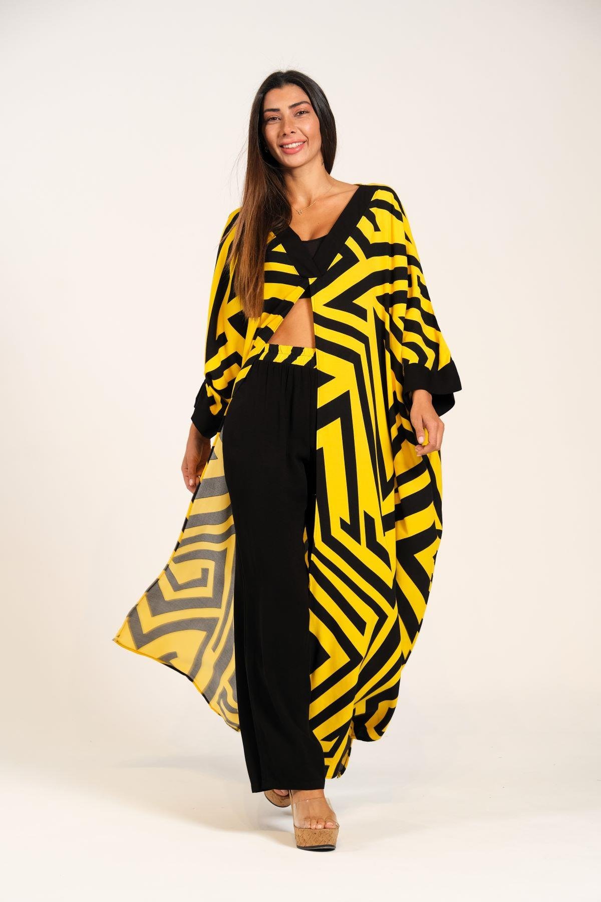 Sarı Siyah Desenli V Yaka Önden Yırtmaçlı Cepli Tunik Pantolon İkili Takım