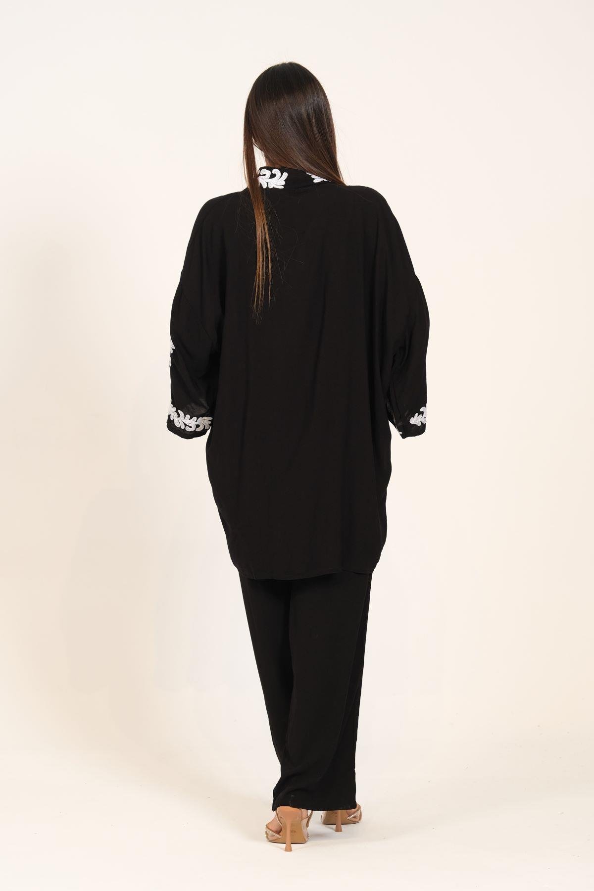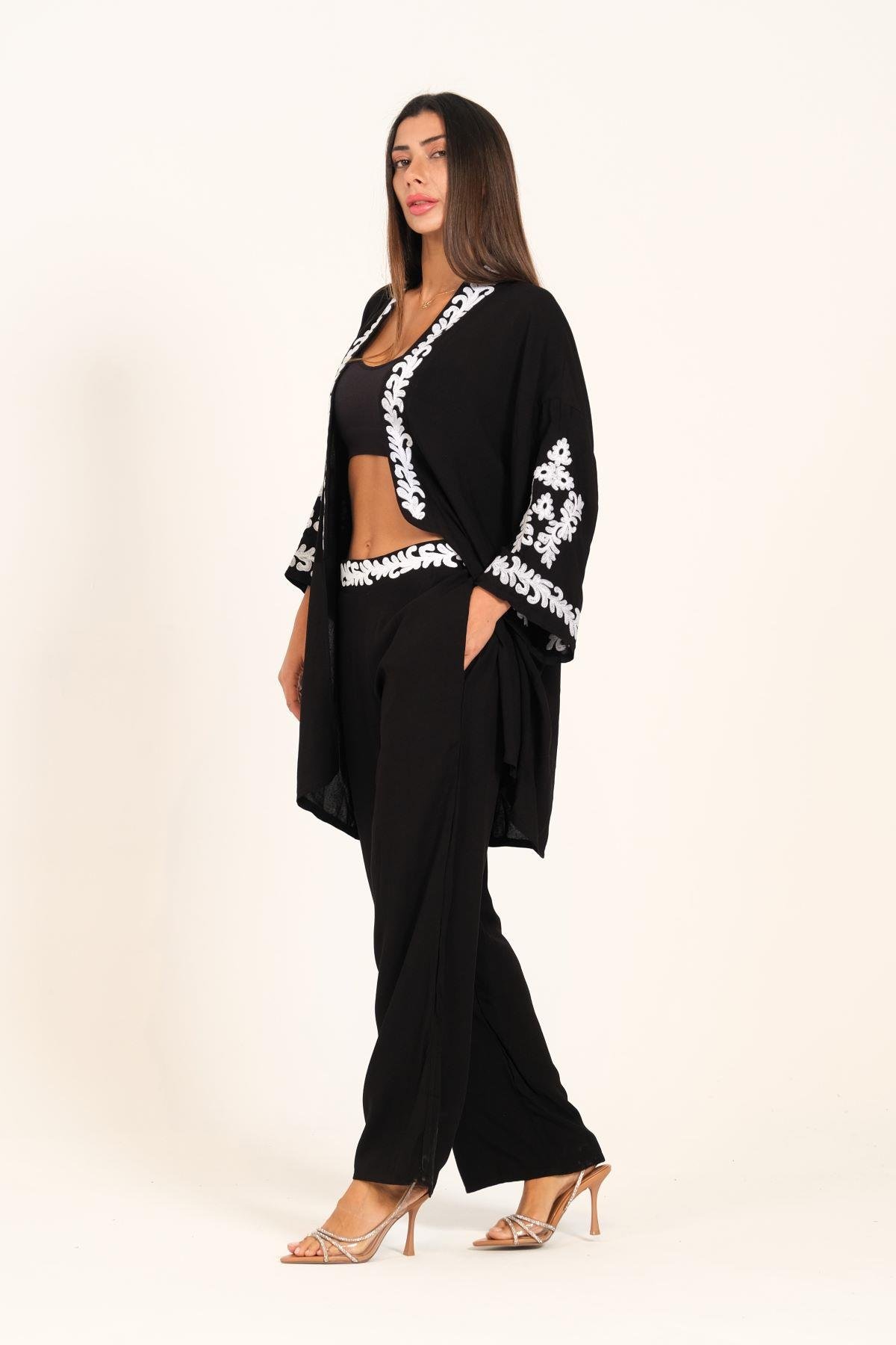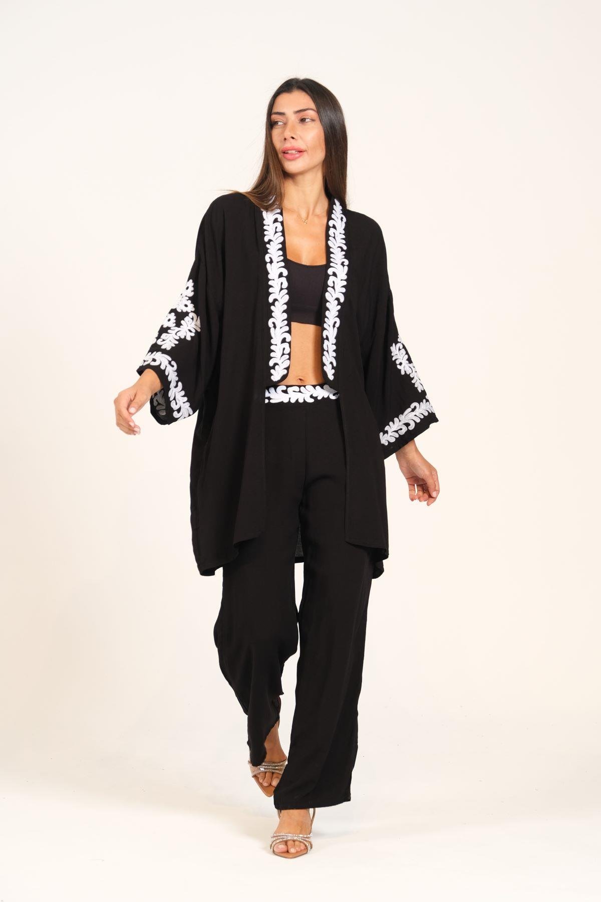 Siyah Aplike Nakışlı Cepli Tunik Pantolon İkili Takım