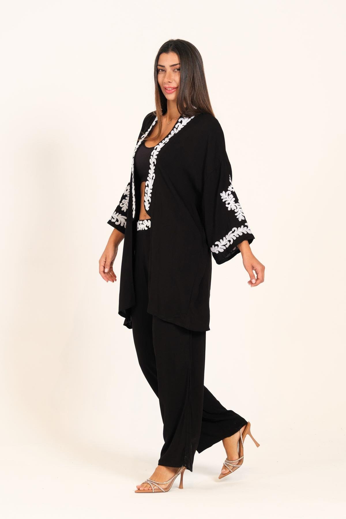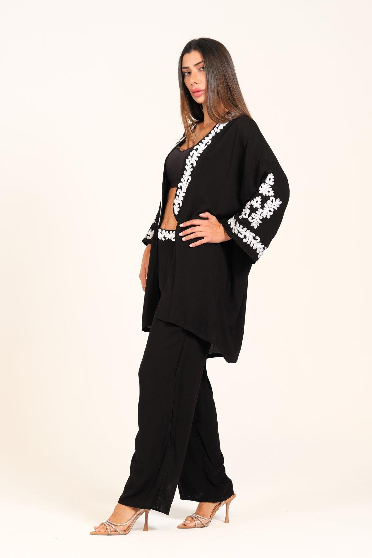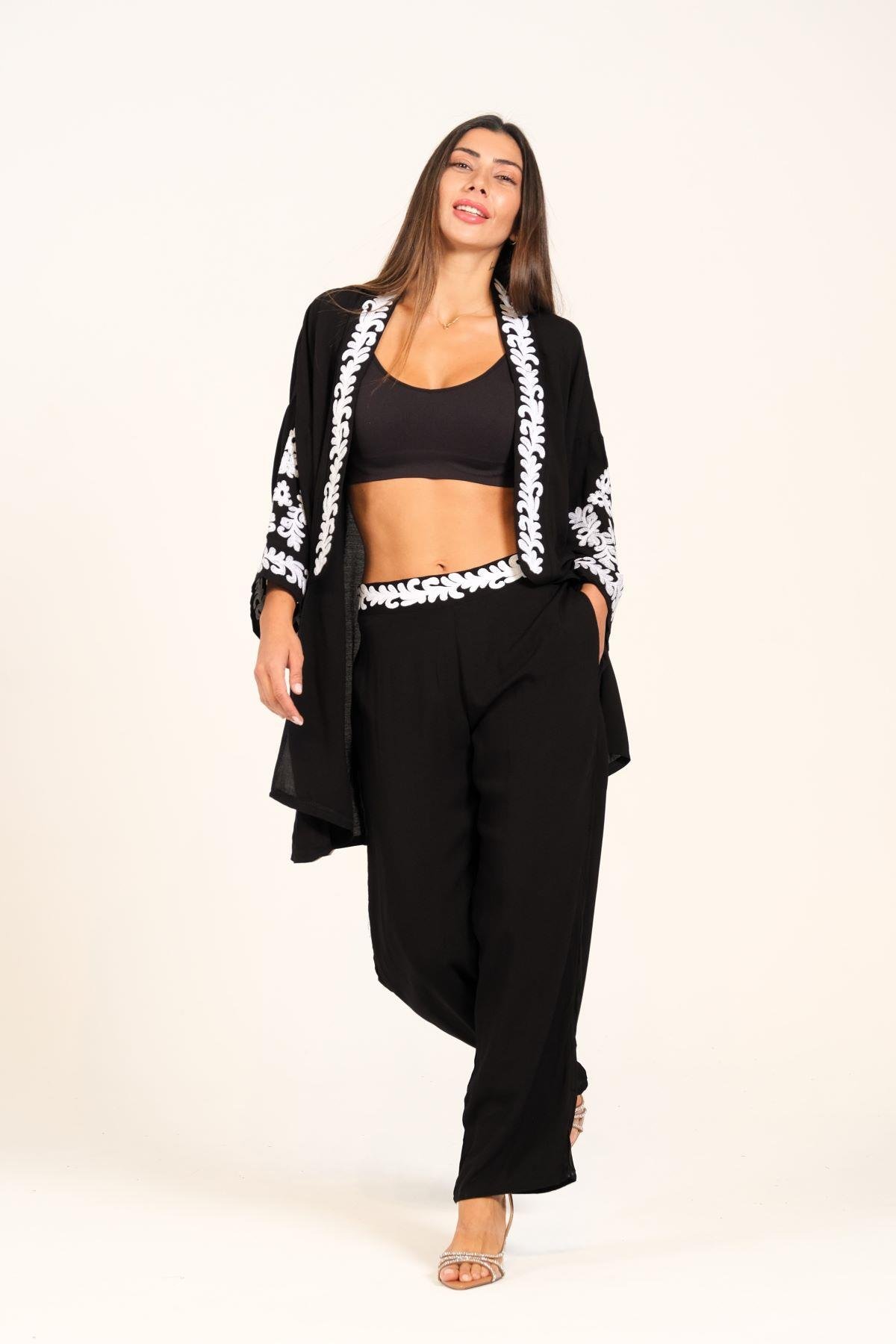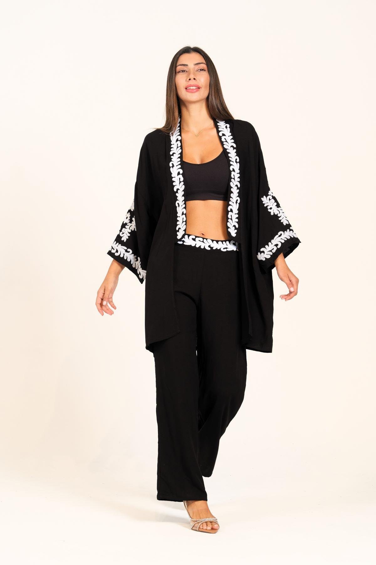 Siyah Aplike Nakışlı Cepli Tunik Pantolon İkili Takım