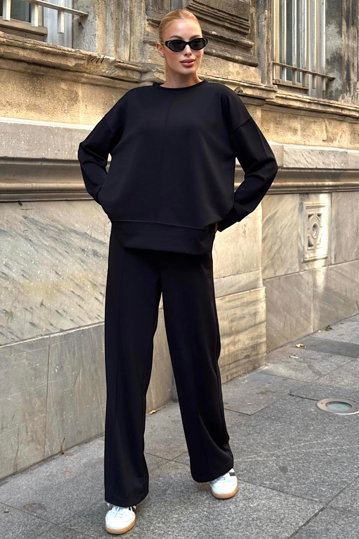 Siyah Bisiklet Yaka Beli Lastikli Bol Paça Oysho Kumaş İkili Takım (TKWOBSSSV216)