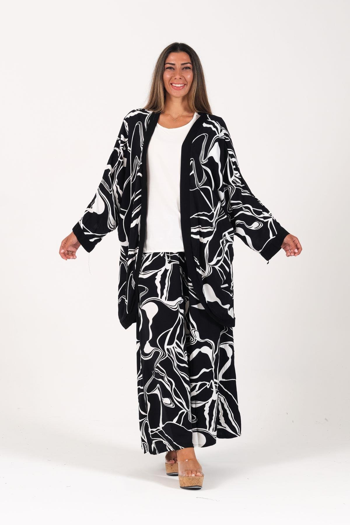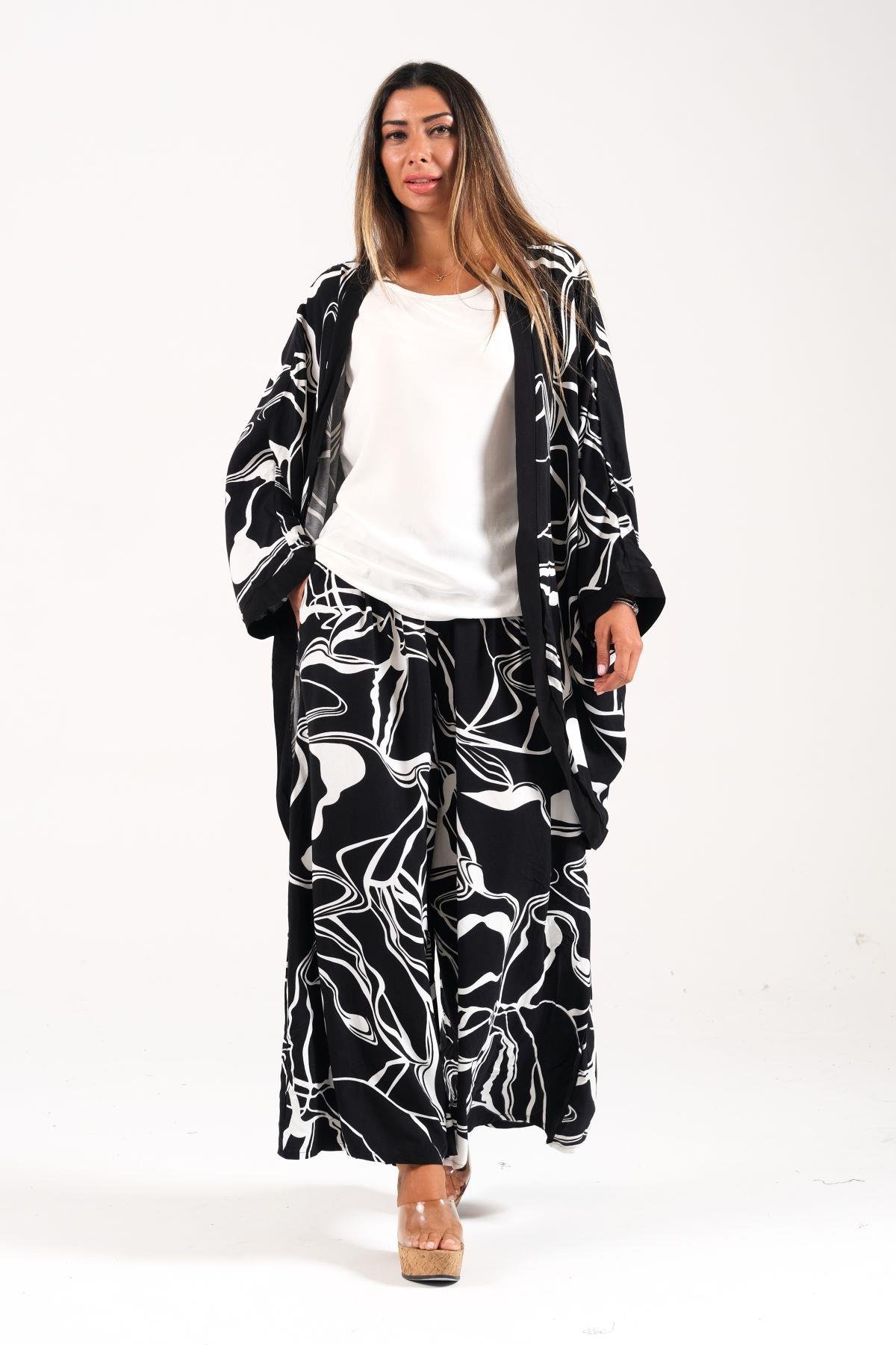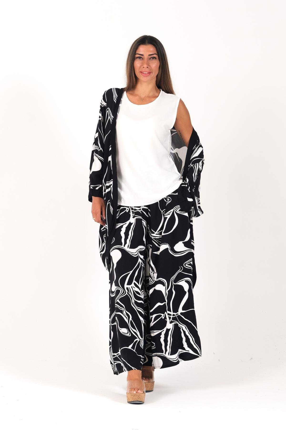 Siyah Desenli Tunik Bluz Pantolon Üçlü Takım