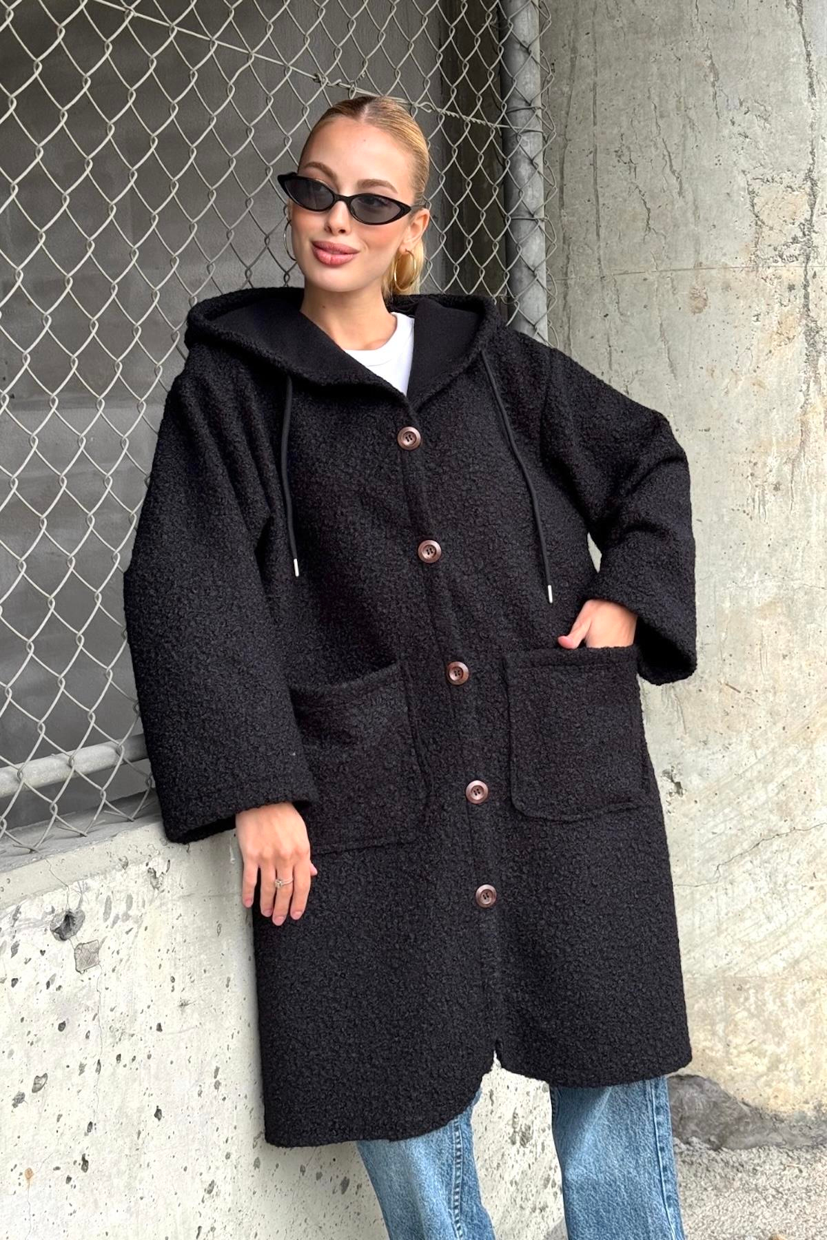 Bej Kapüşonlu Düğmeli Cepli Buklet Kaban