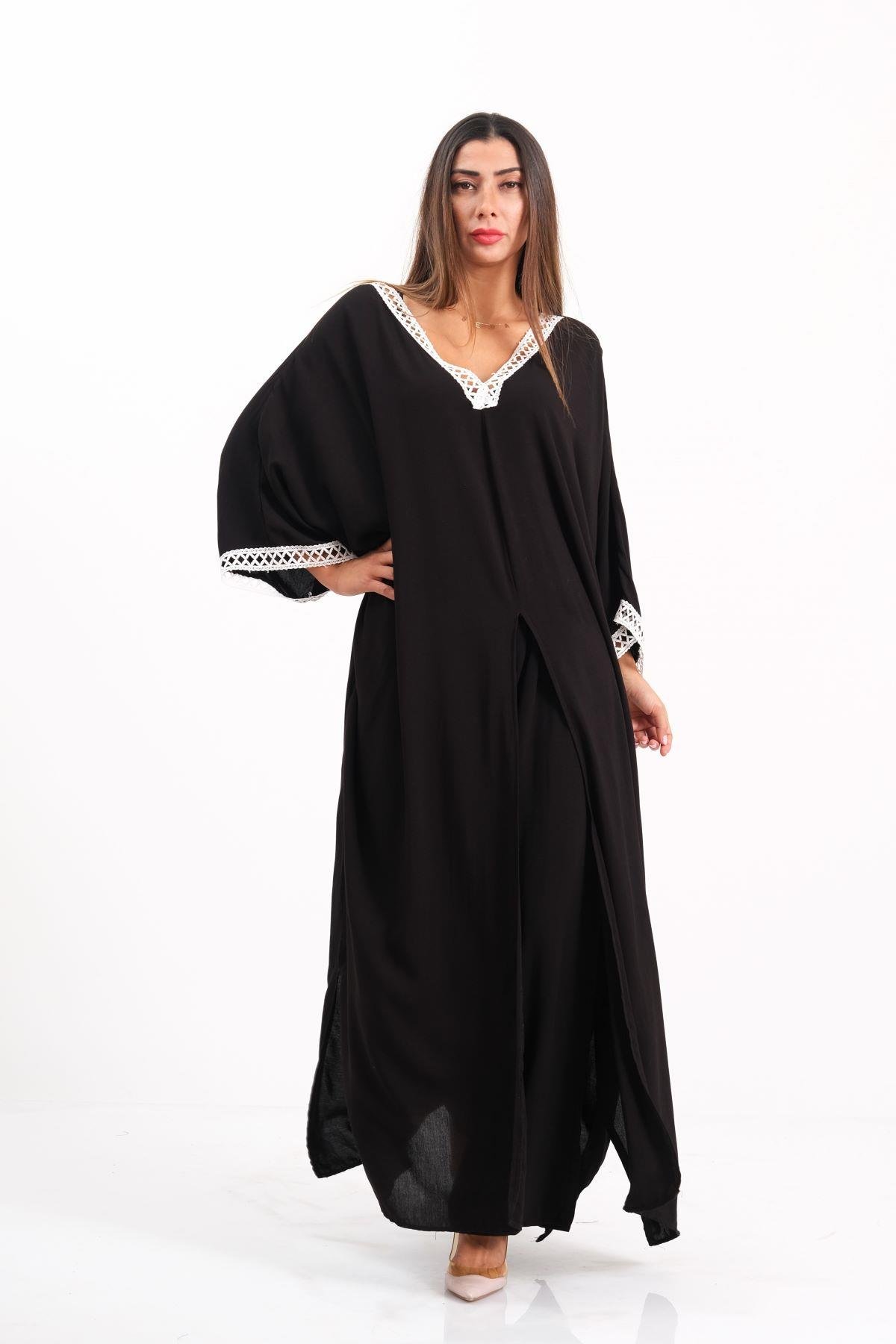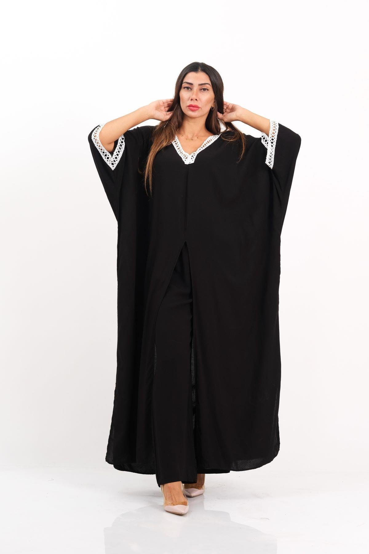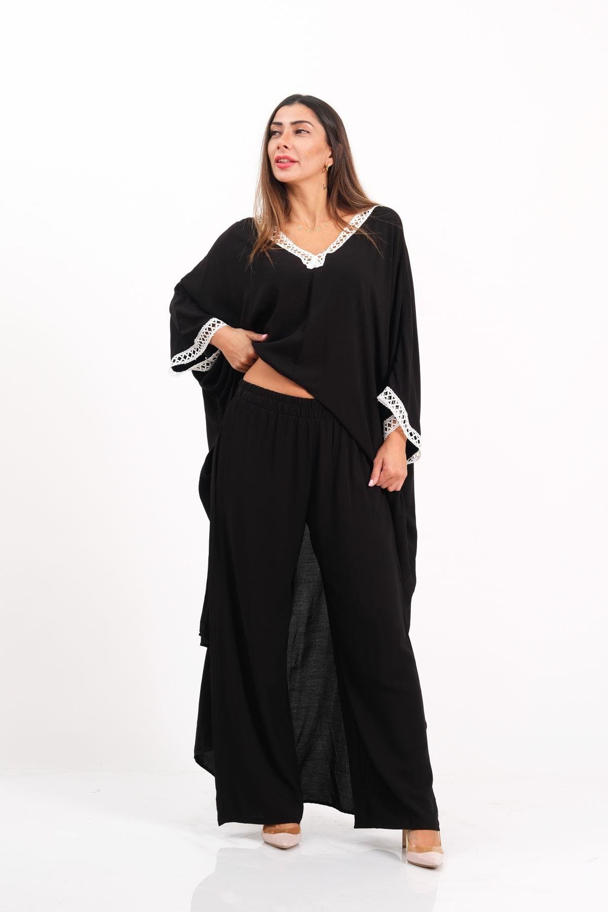 Siyah V Yaka Dantel Detaylı Önden Yırtmaçlı Cepli Tunik Pantolon İkili Takım
