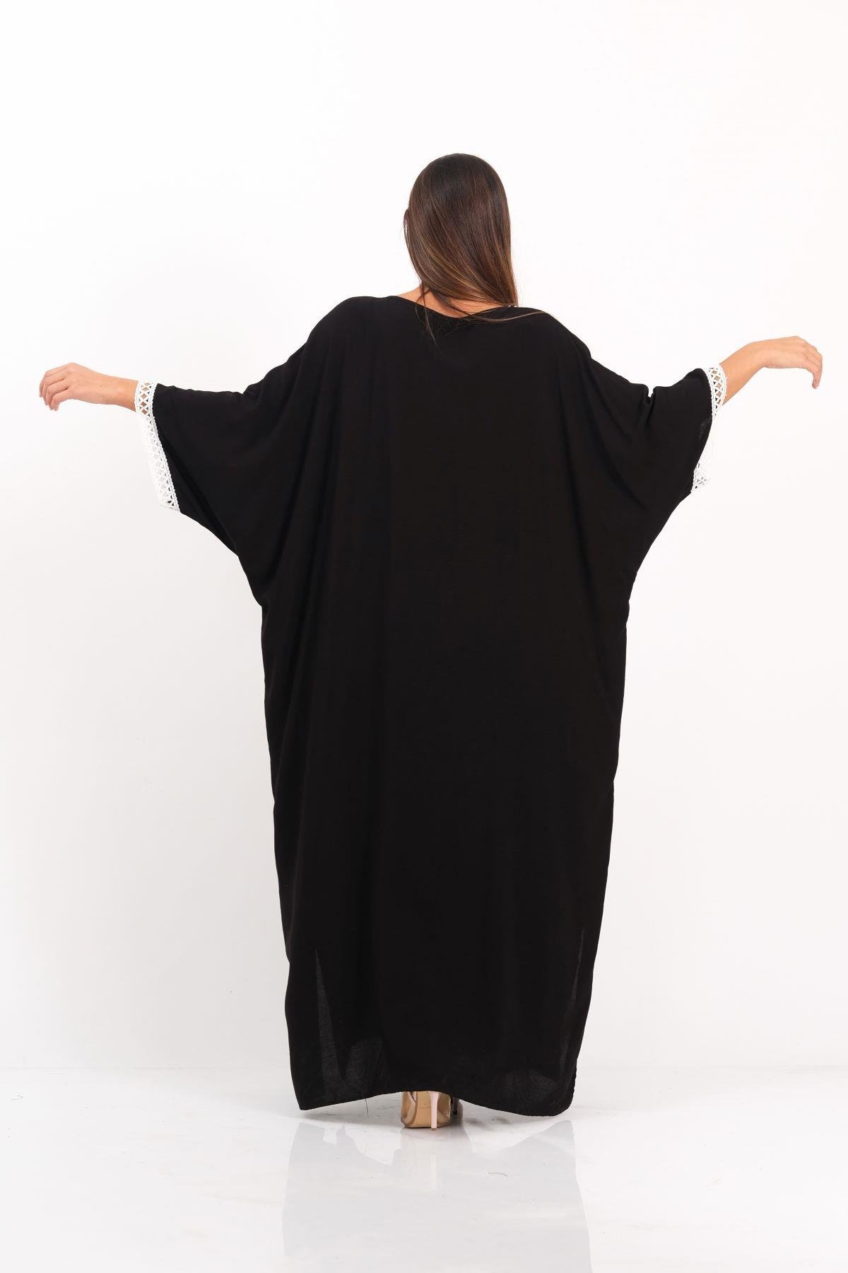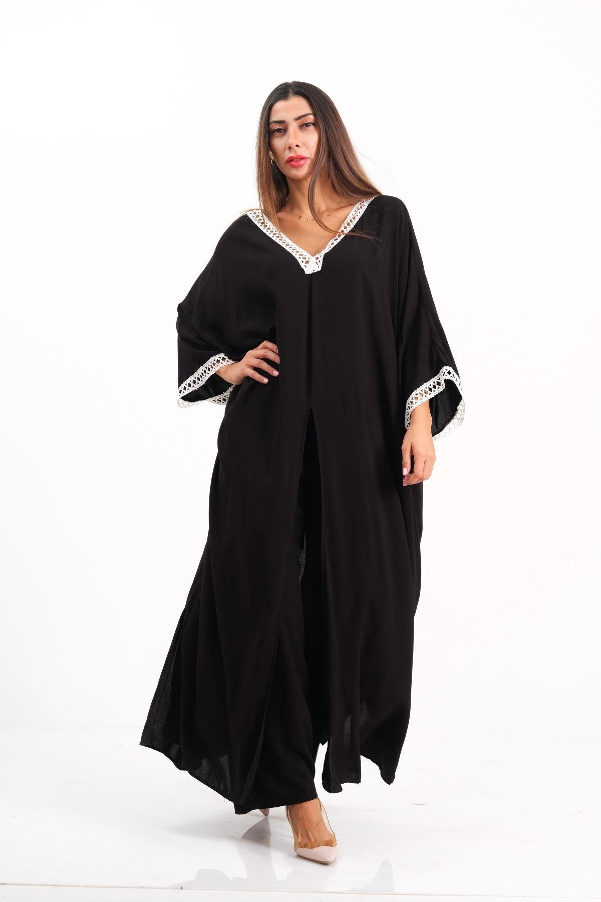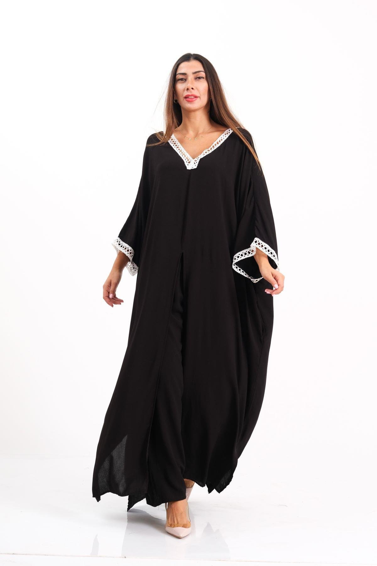 Siyah V Yaka Dantel Detaylı Önden Yırtmaçlı Cepli Tunik Pantolon İkili Takım