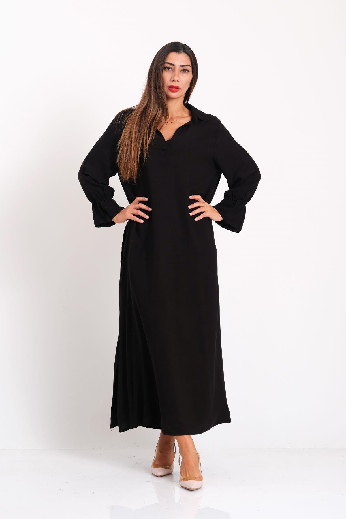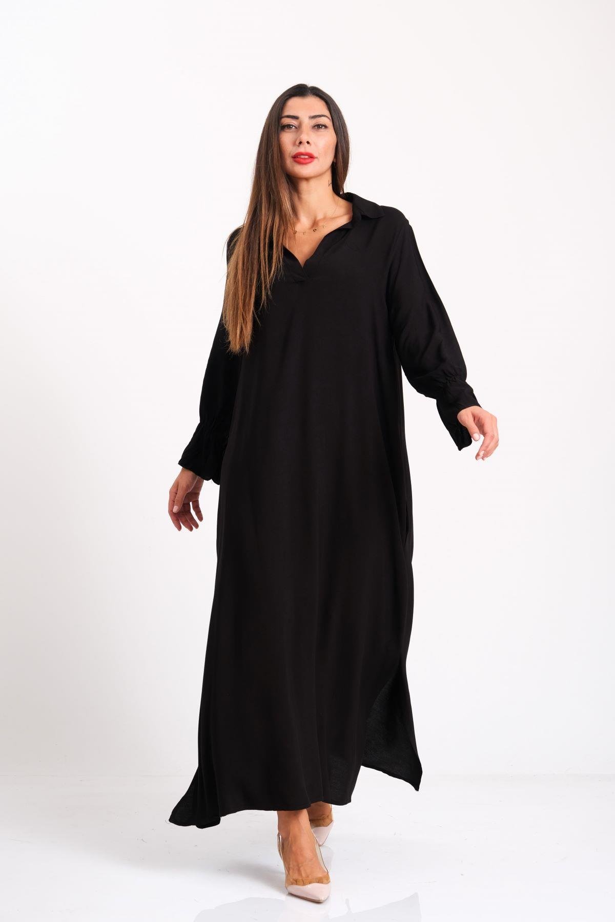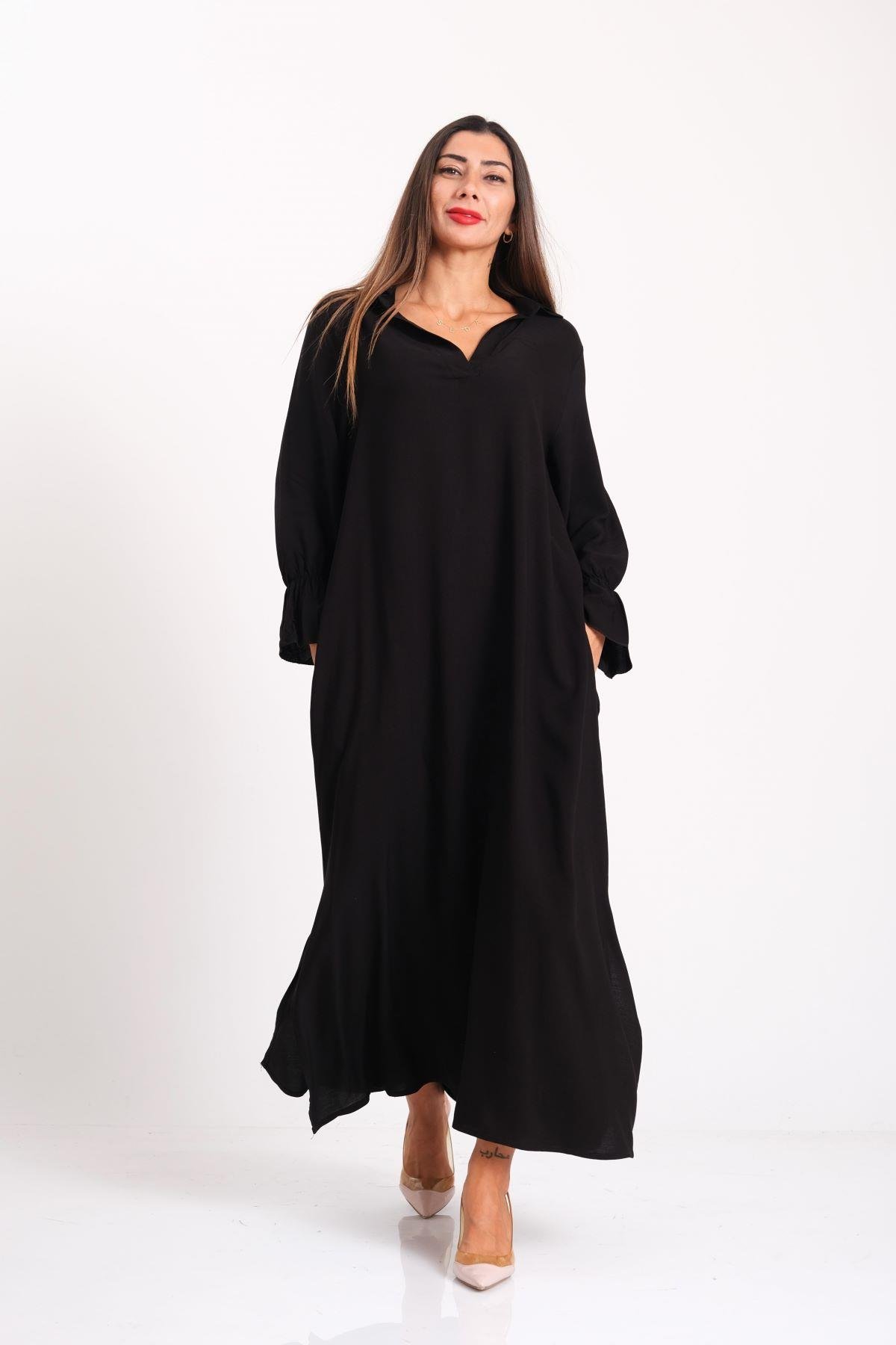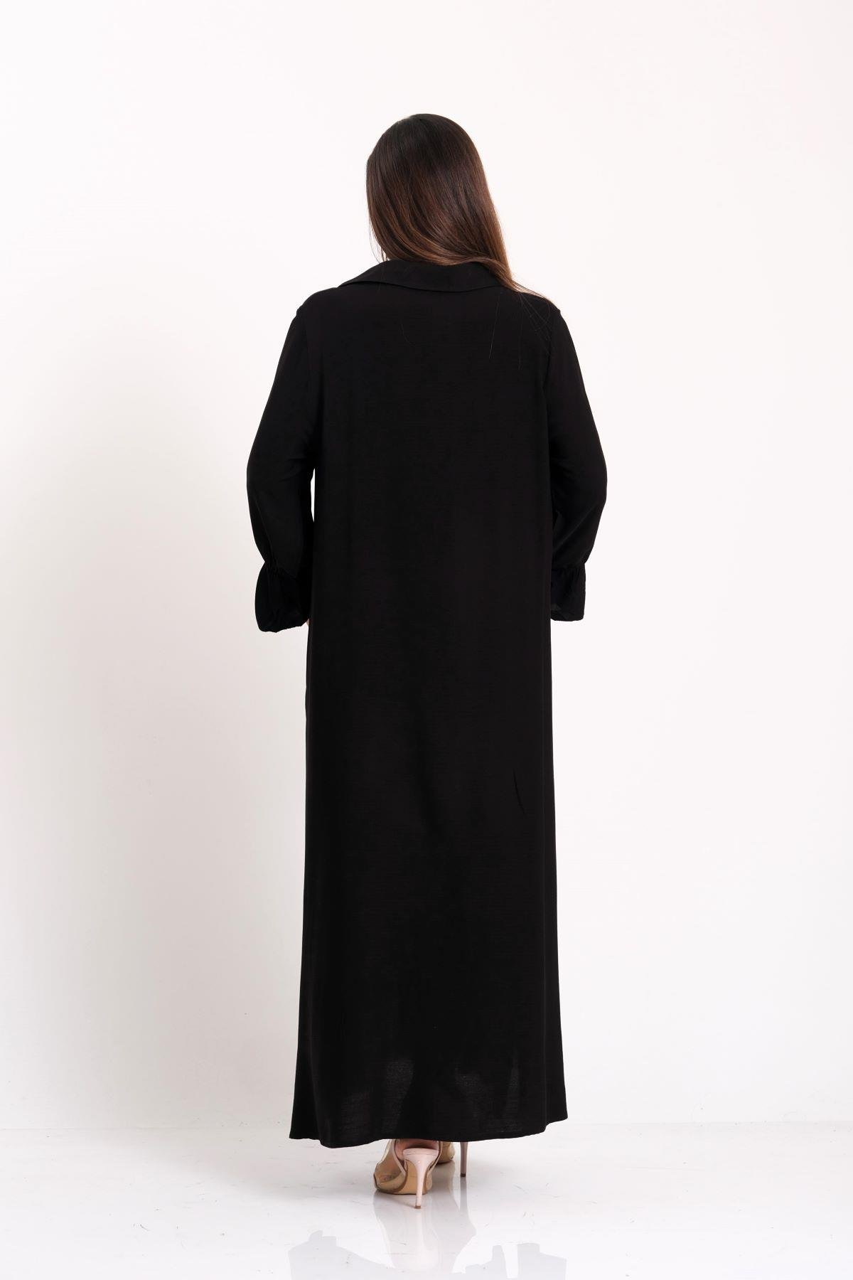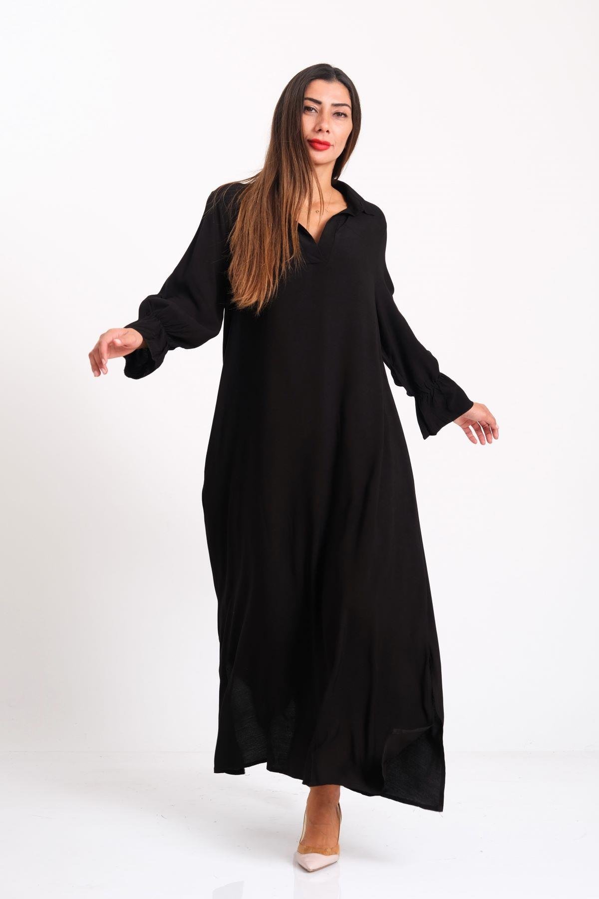 Siyah V Yaka Kolları Fırfırlı Cepli Uzun Elbise (EUW3DFSSS921)