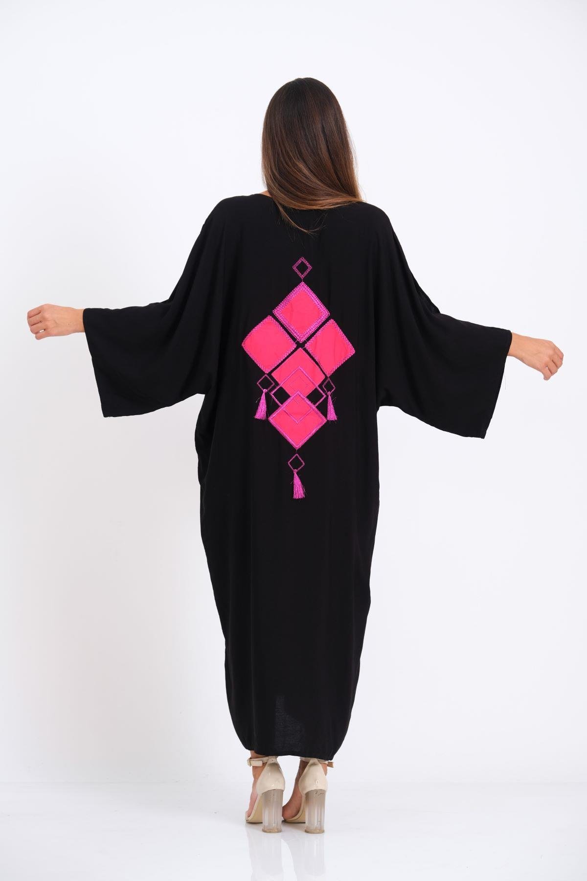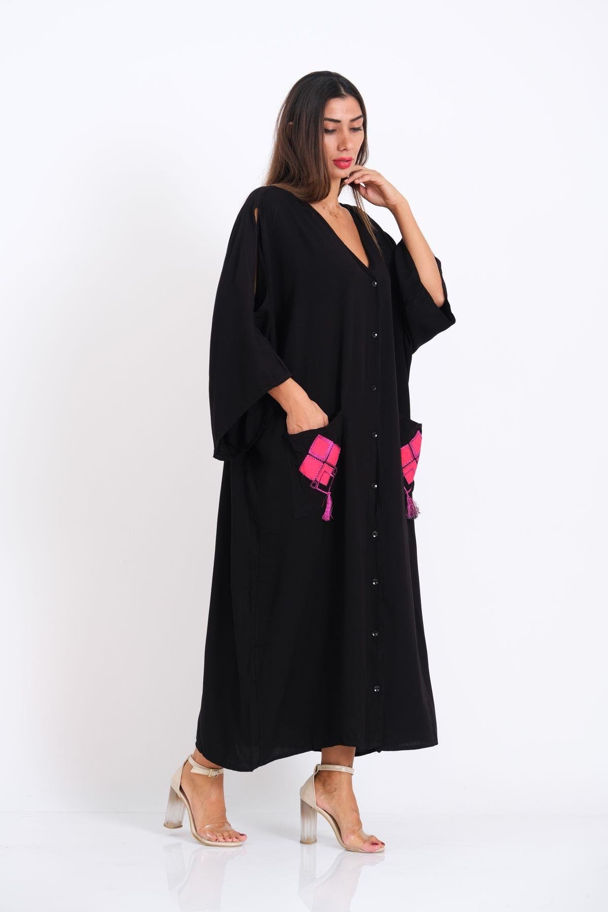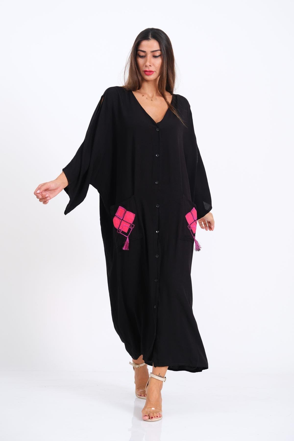 Siyah V Yaka Omuzu Pencereli Cepleri ve Sırtı Aplike Nakışlı Püsküllü Oversize Uzun Gömlek Elbise