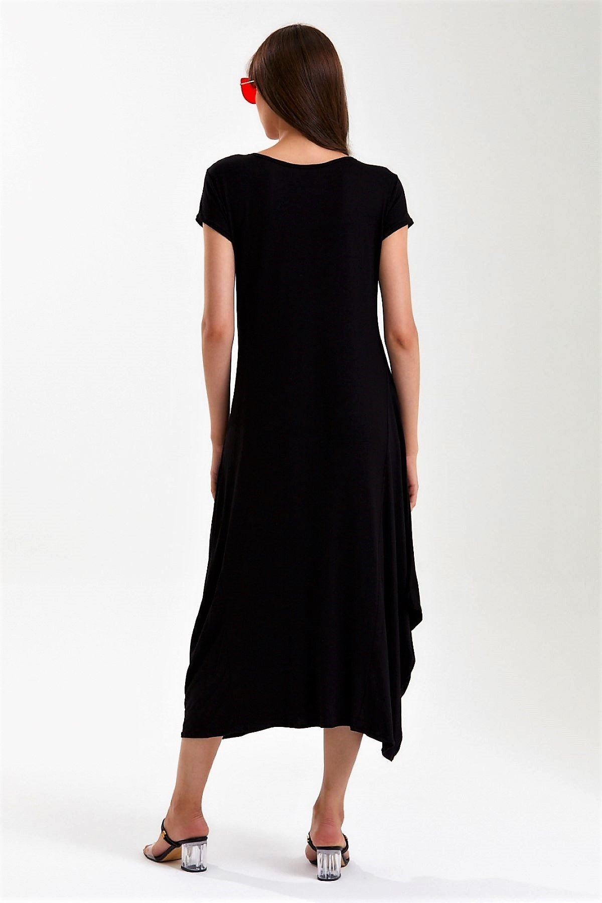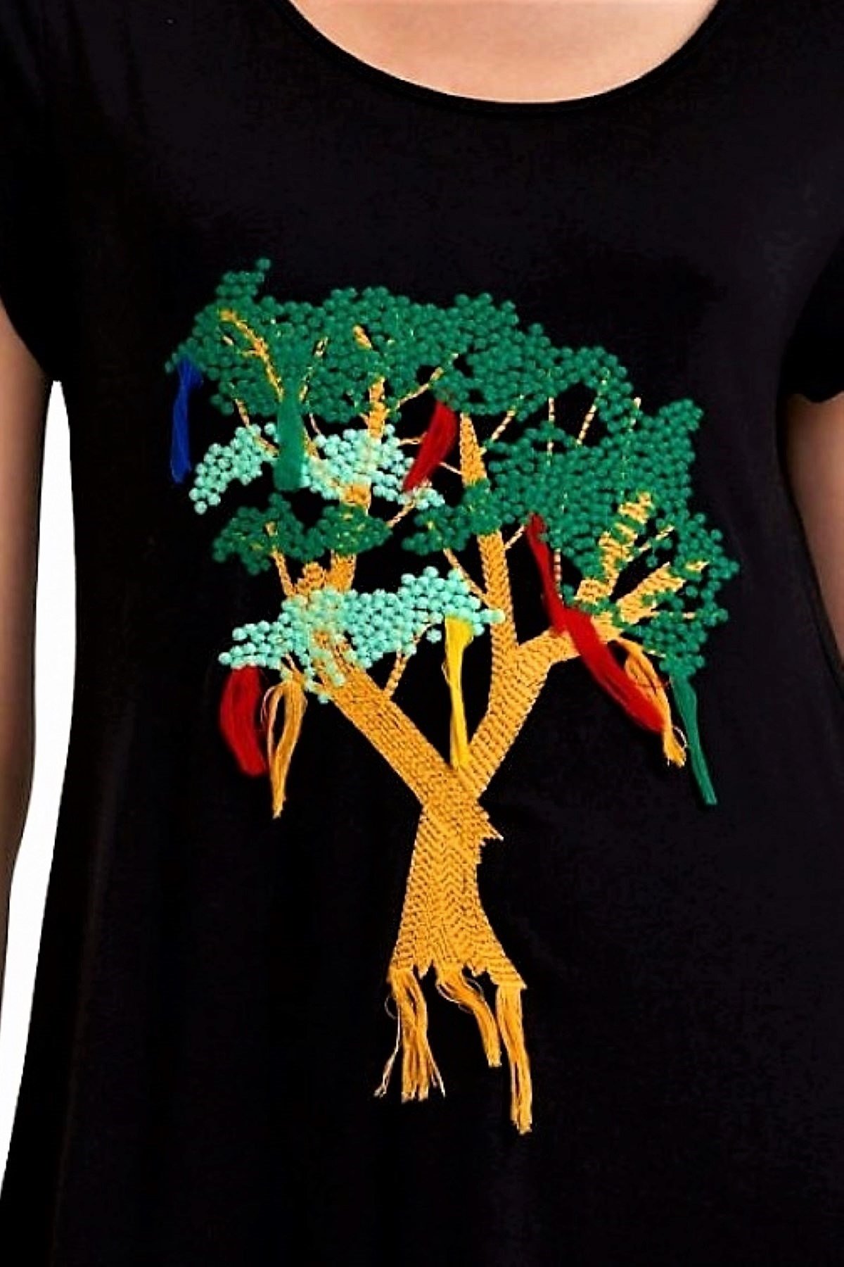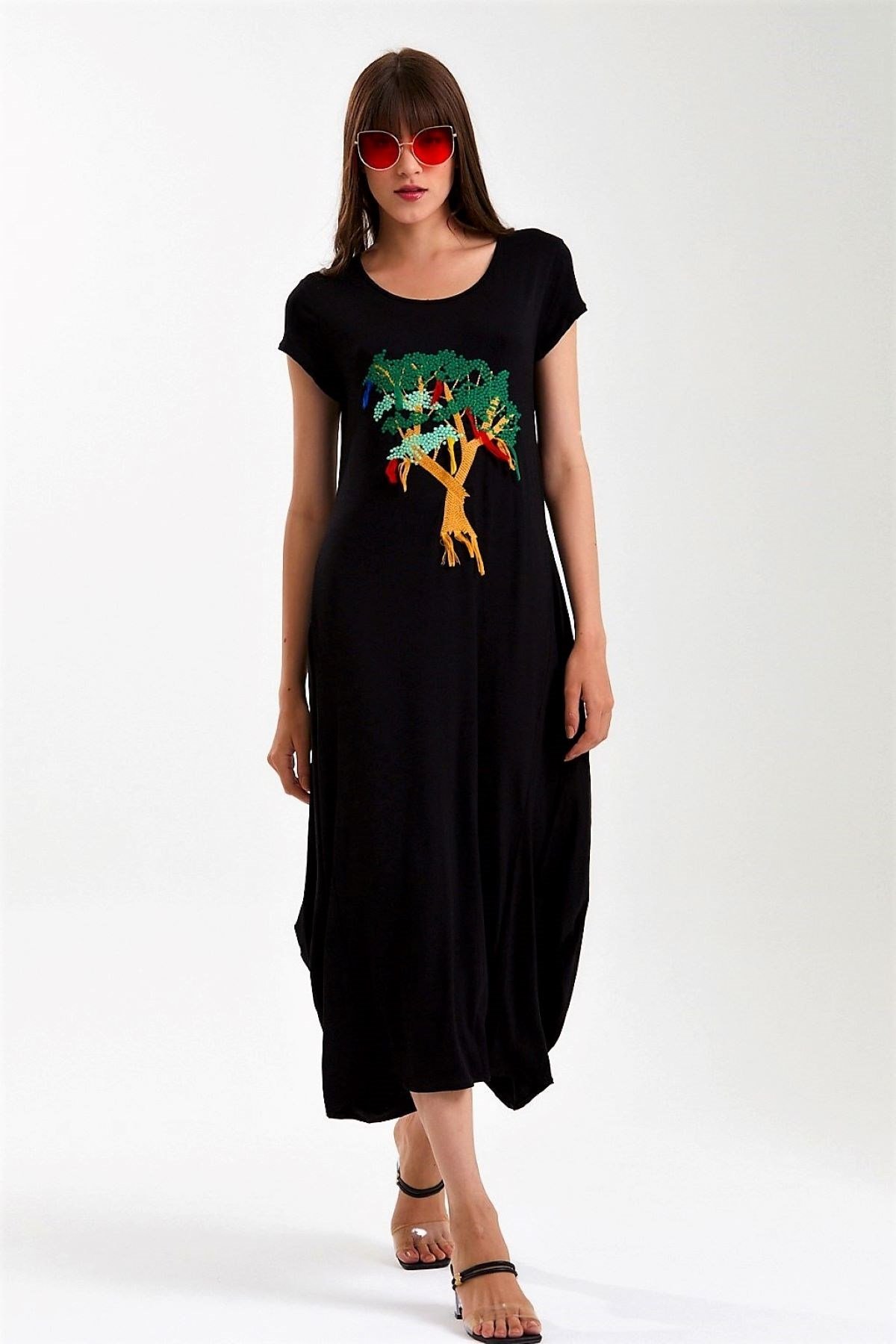 Siyah Yuvarlak Yaka Kısa Kollu Ağaç Nakışlı Püsküllü Uzun Elbise