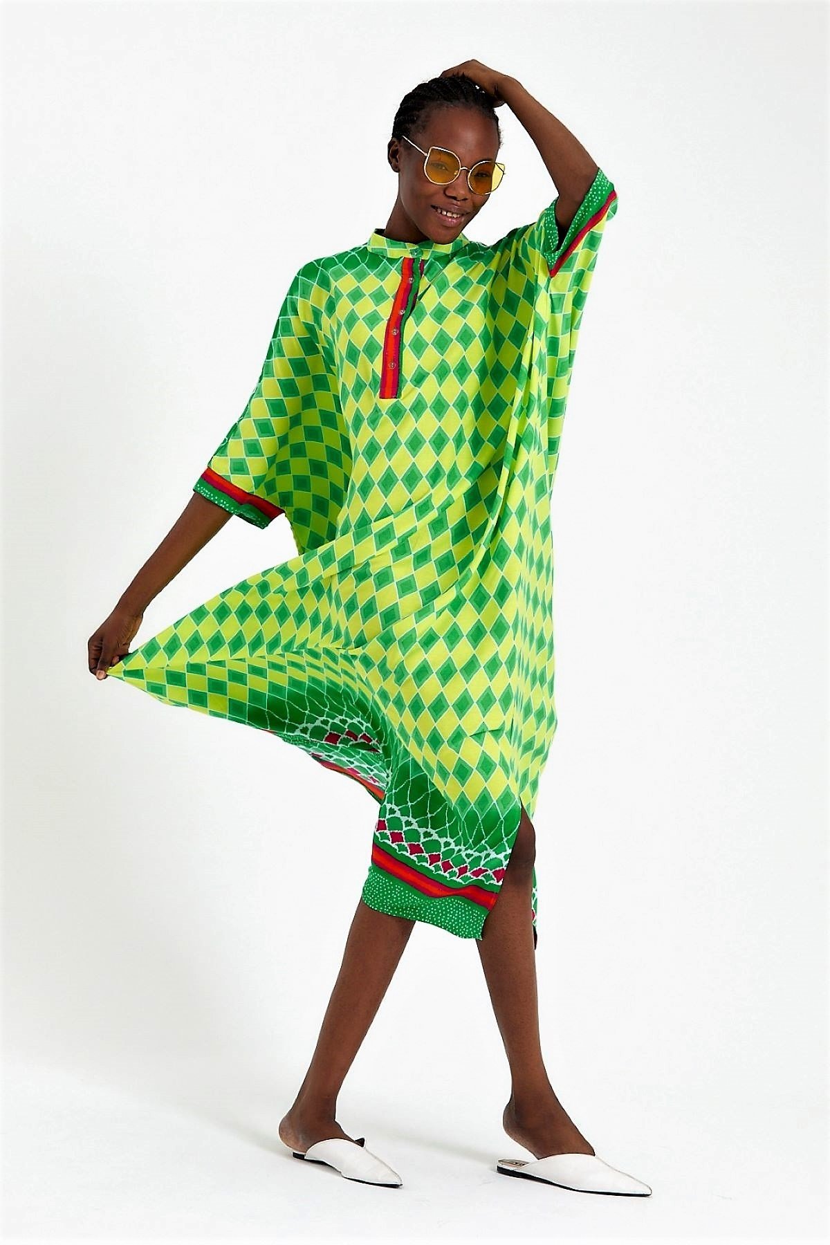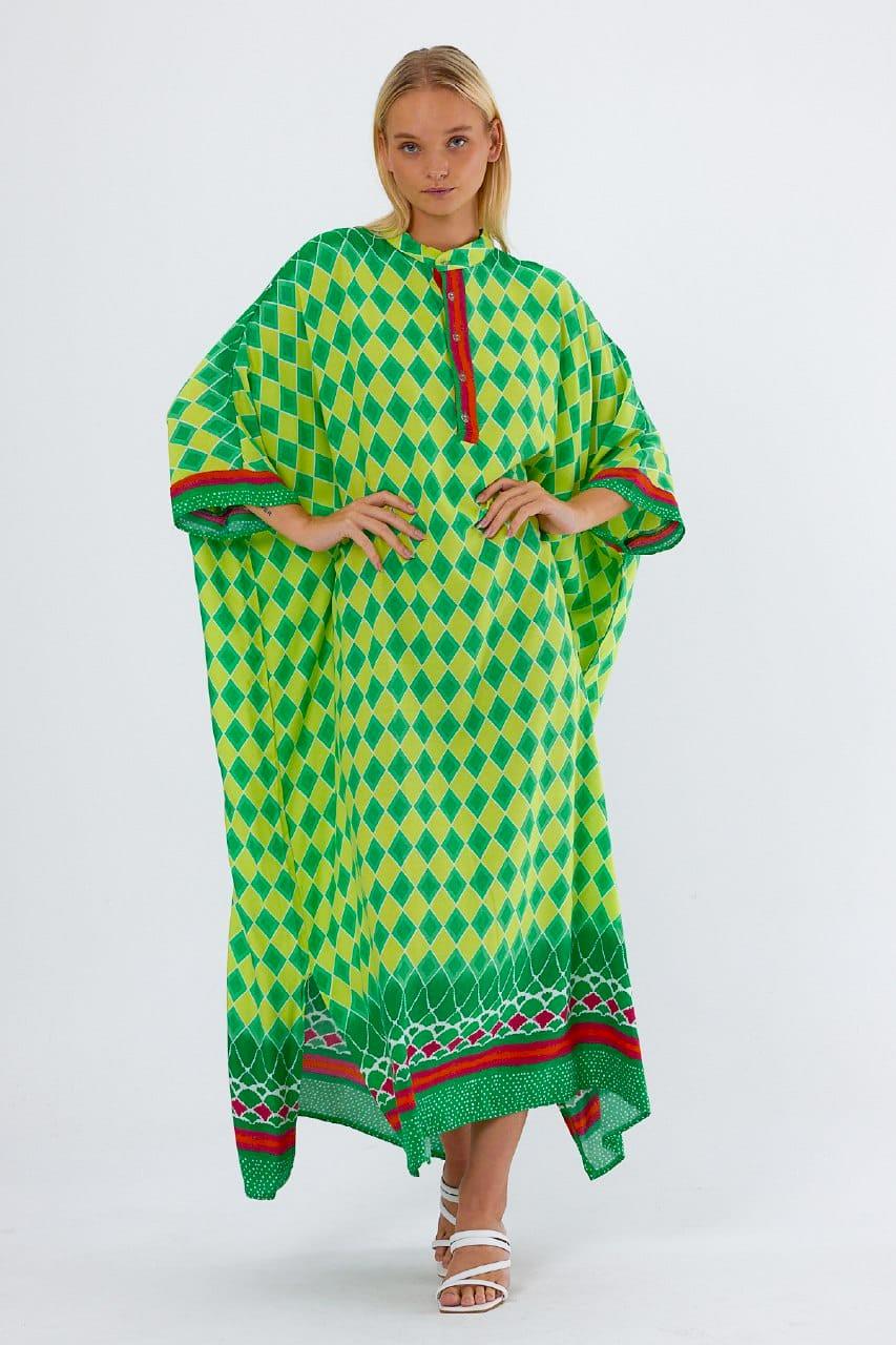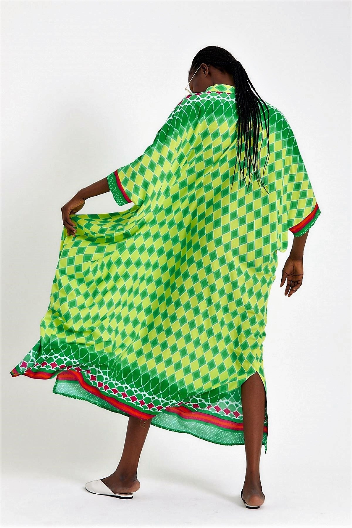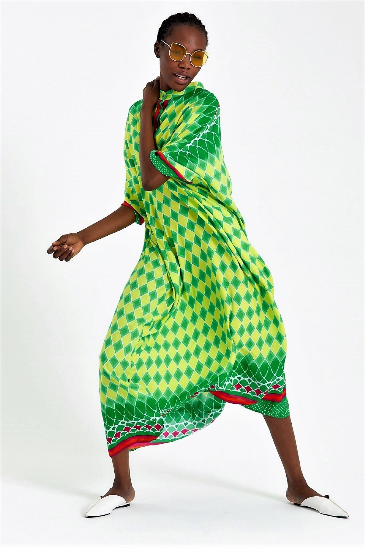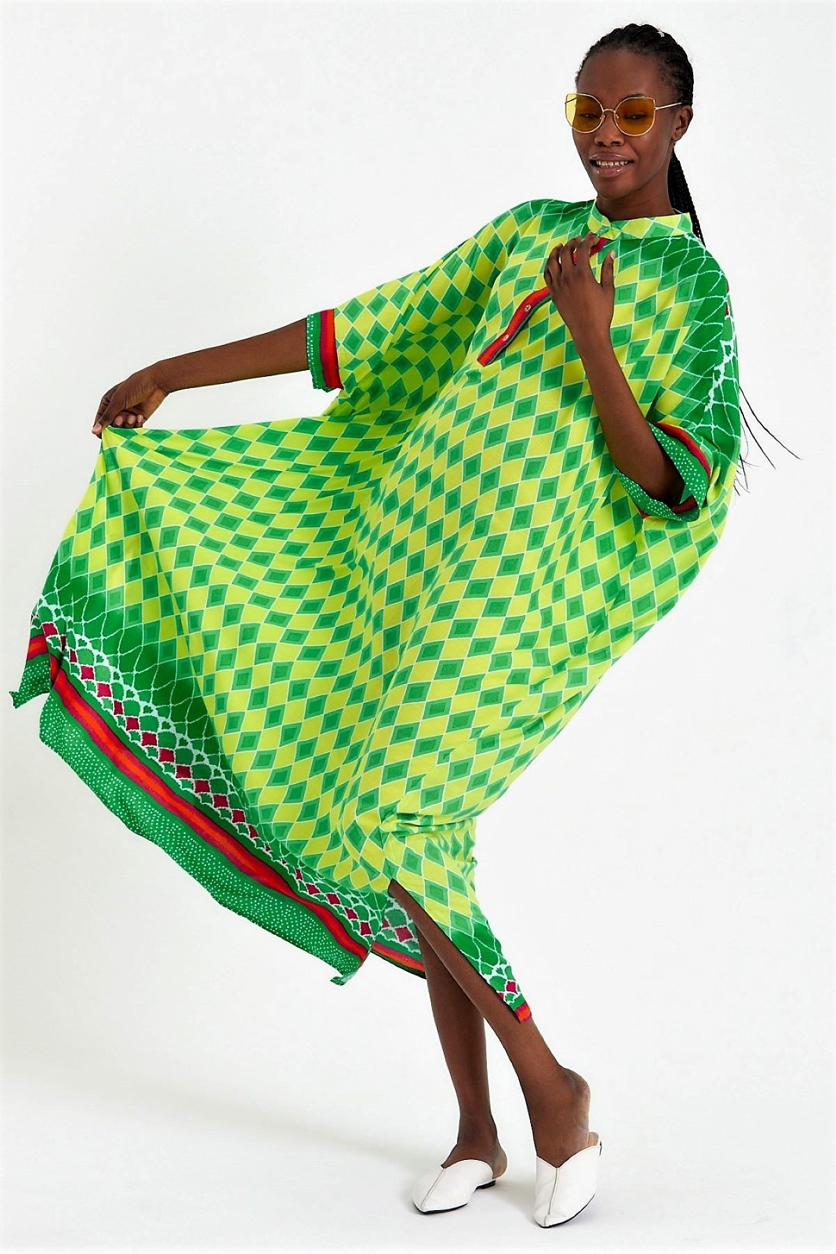 Yeşil Hakim Yaka Baklava Desen Oversize Uzun Elbise