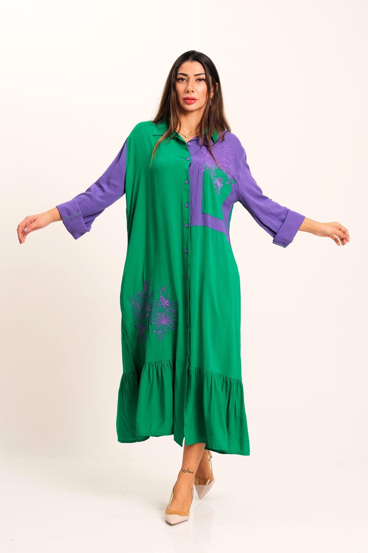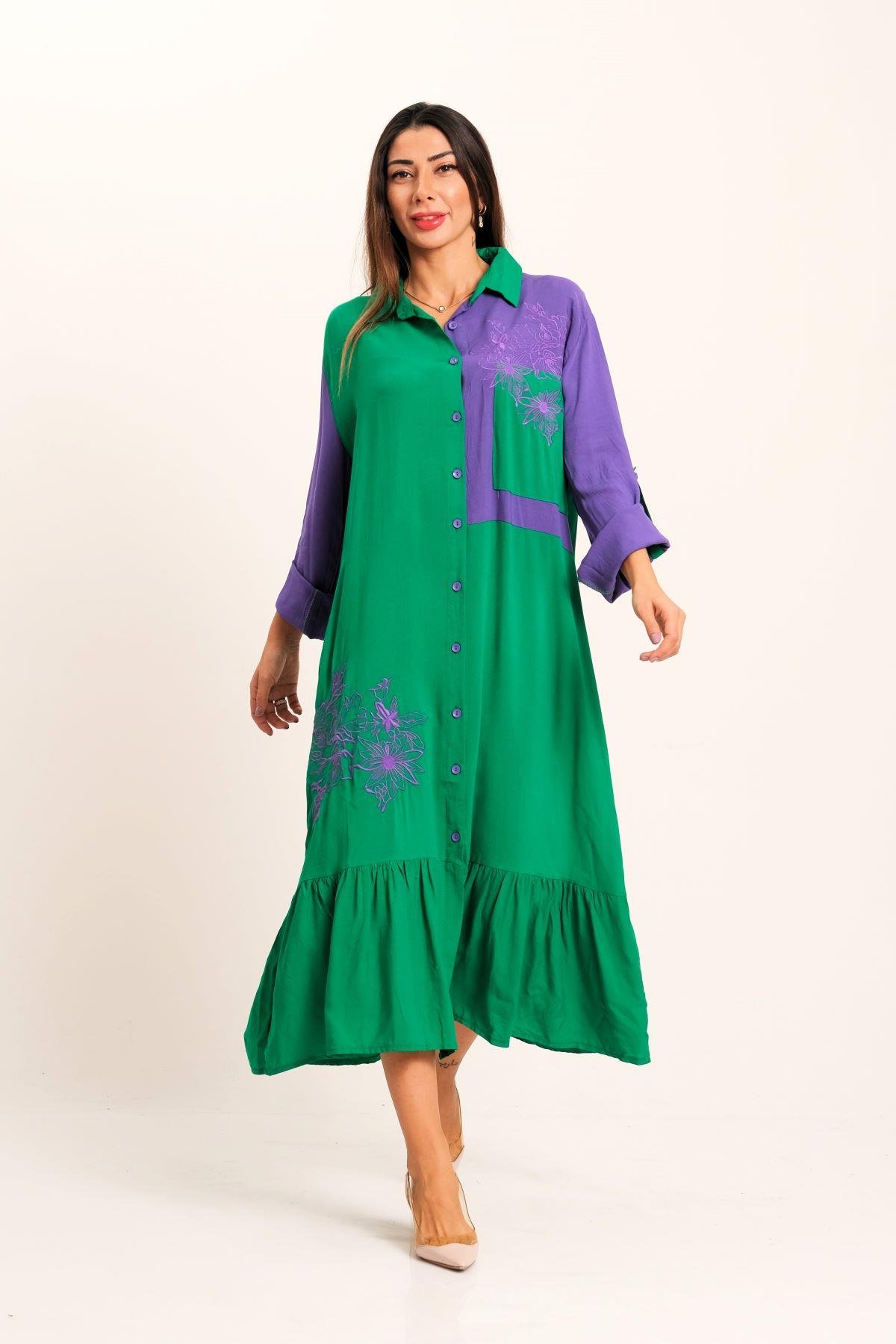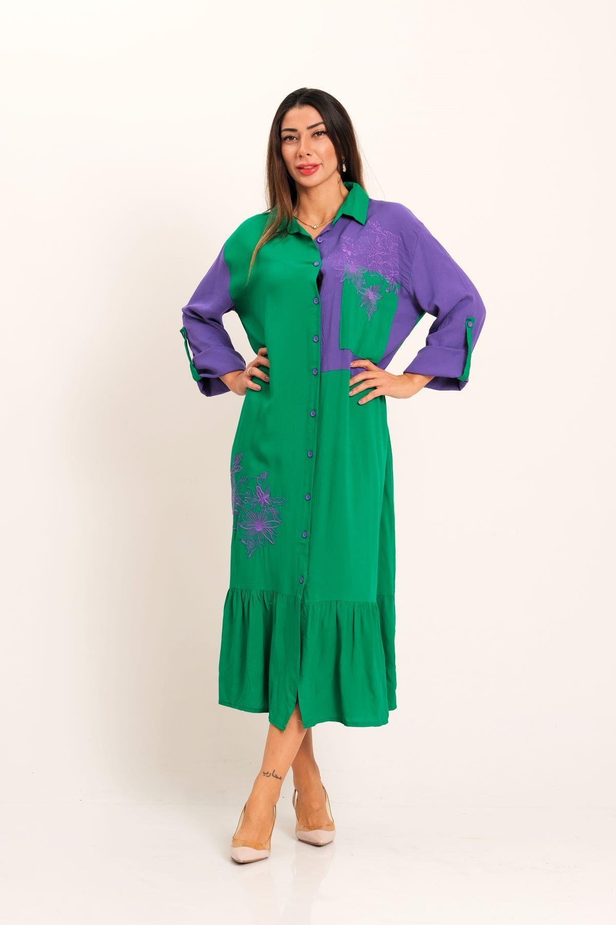Yeşil Mor Garnili Önü ve Eteği Nakışlı Kolu Apoletli Uzun Gömlek Elbise