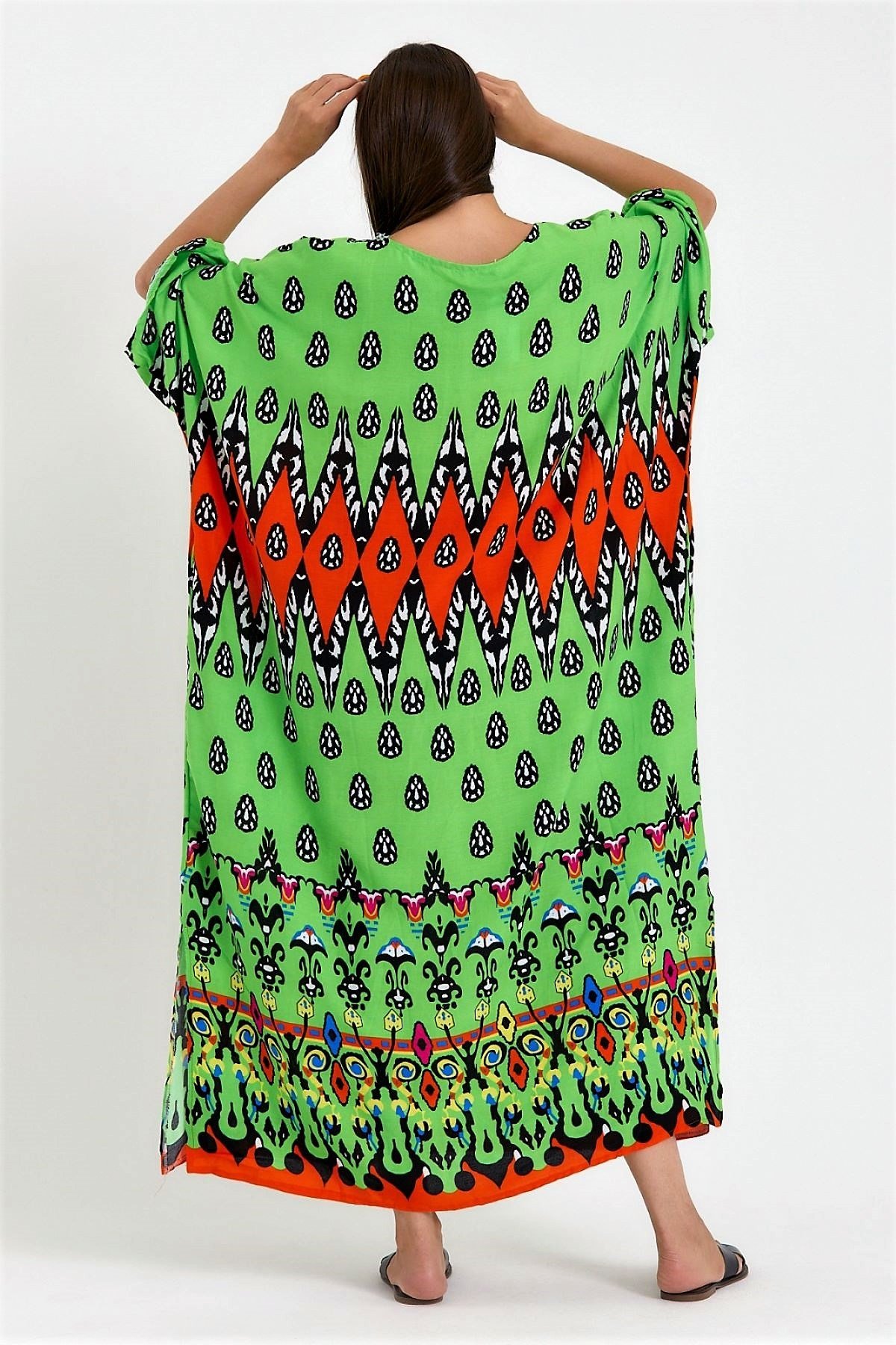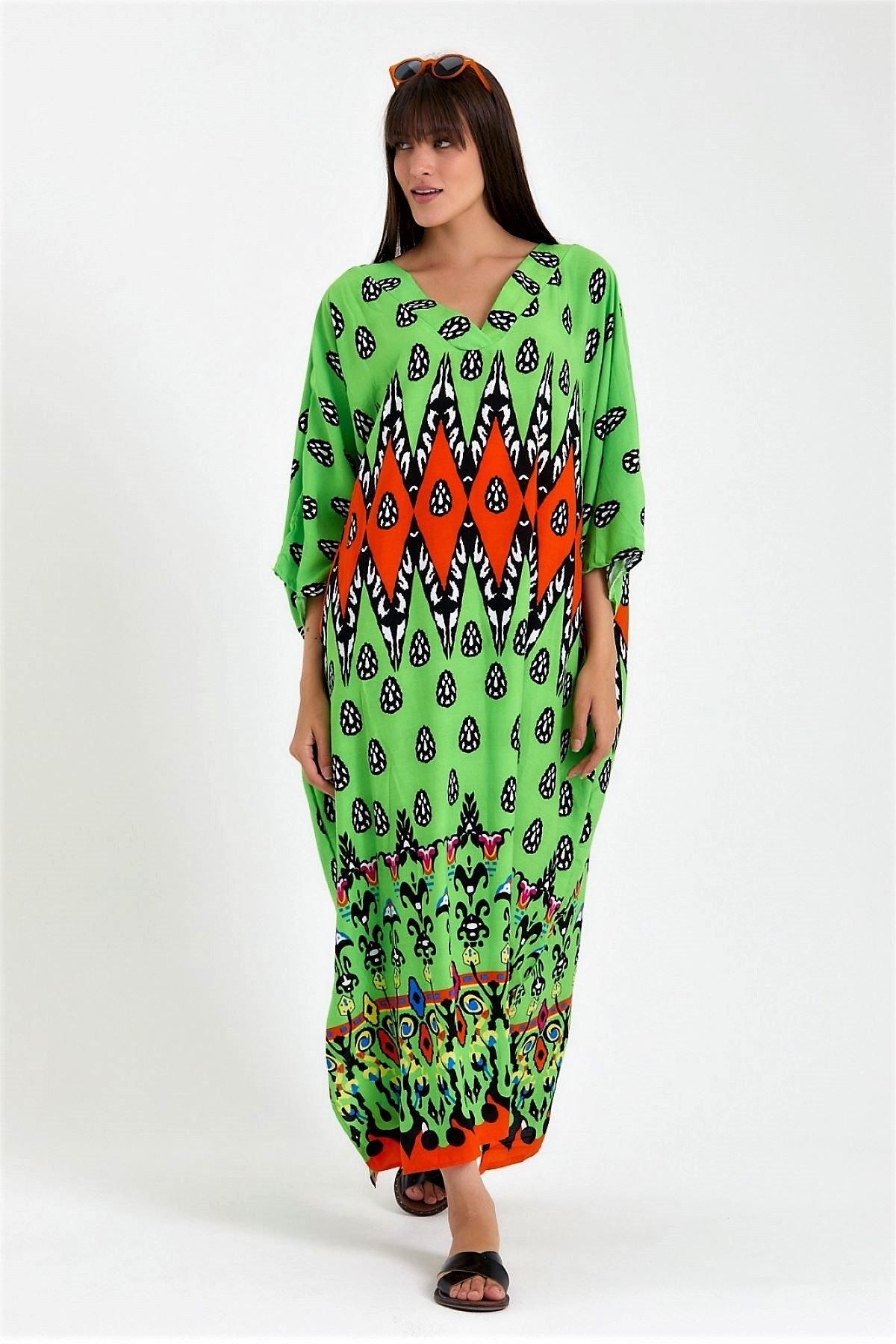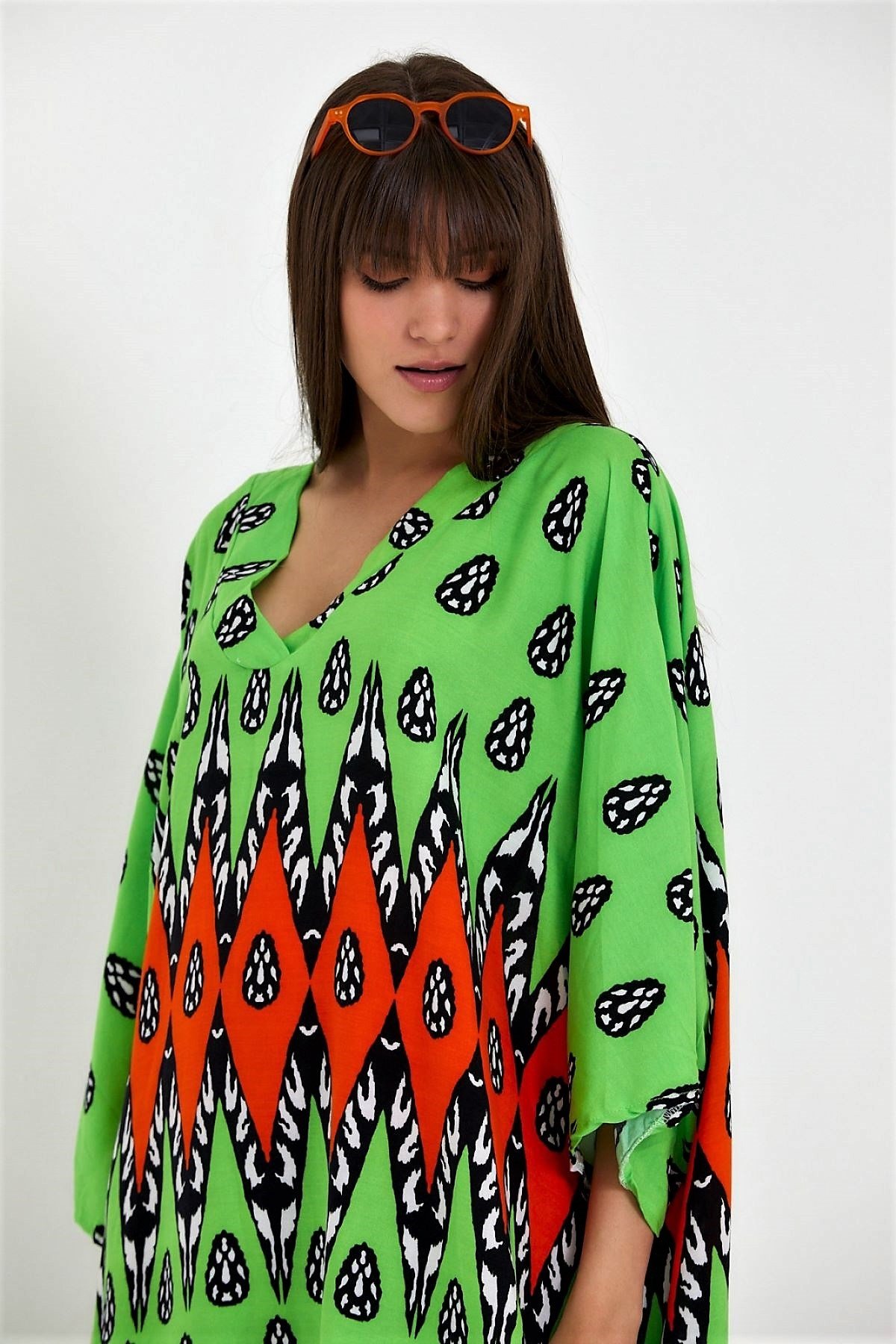 Yeşil Turuncu Desenli V Yaka Yarasa Kol Oversize Uzun Elbise (EUWVDYSS)