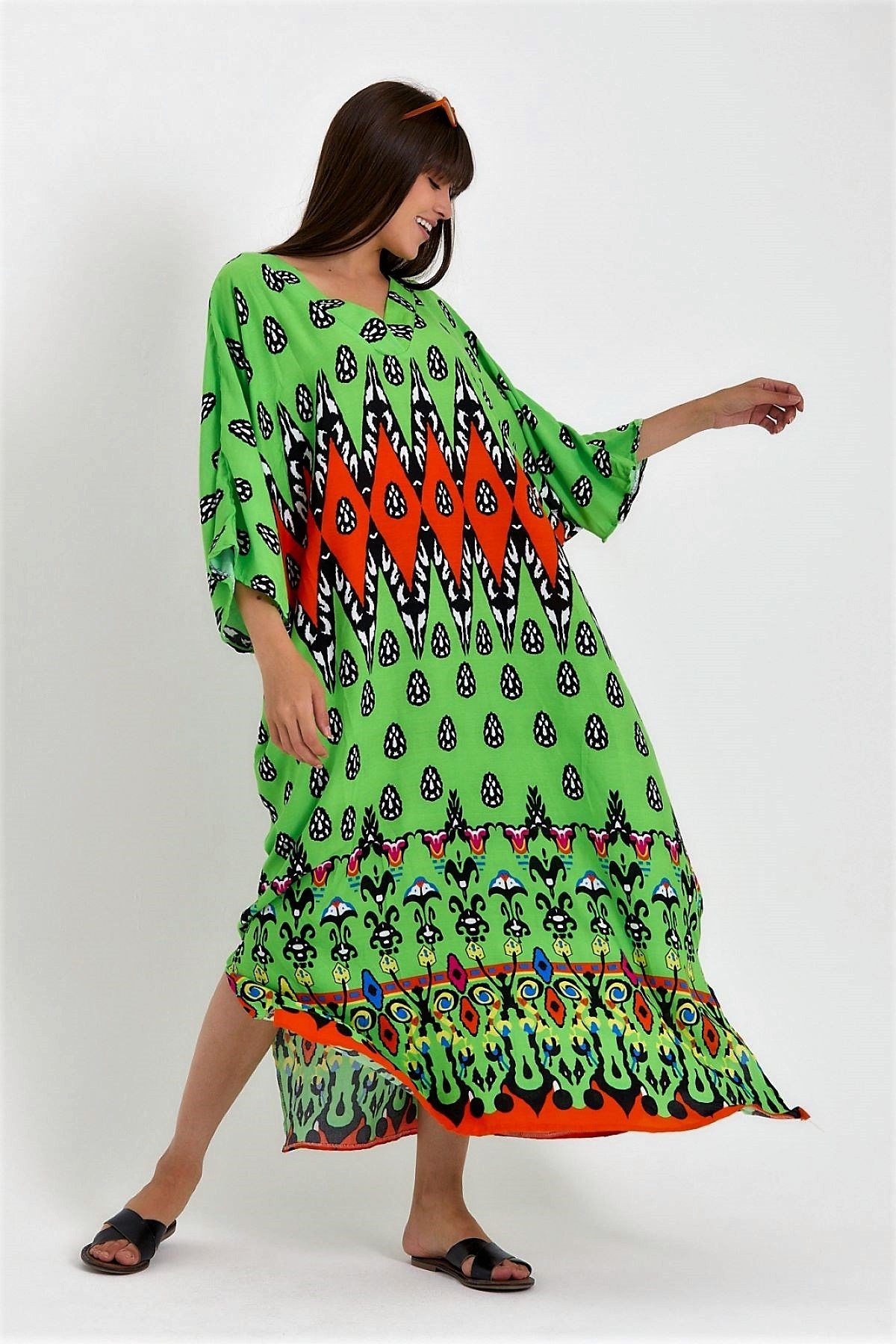 Yeşil Turuncu Desenli V Yaka Yarasa Kol Oversize Uzun Elbise