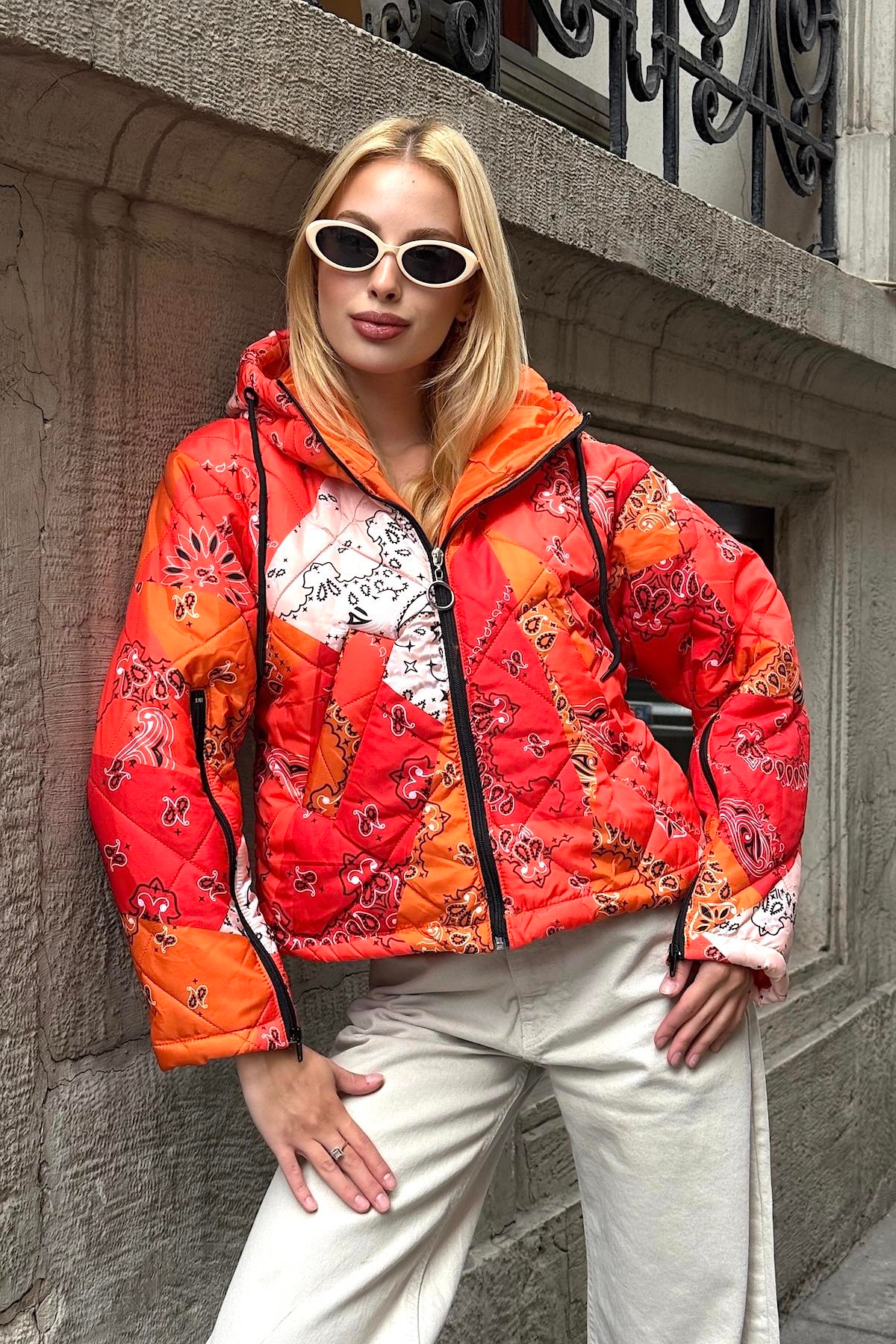 Turuncu Desenli Kapüşonlu Kolları Fermuarlı Kısa Şişme Mont